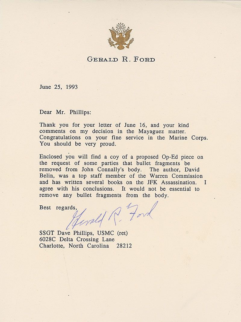 TLS signed “Gerald R. Ford,” one page, 6.25 x 8.5, personal letterhead, June 25, 1993. Letter to SSGT Dave Phillips, a retired Marine. In part: “Thank you…for your kind comments on my decision in the Mayaguez matter…Enclosed you will find a coy [sic] of a proposed Op-Ed piece on the request of some parties that bullet fragments be removed from John Connally’s body. The author, David Belin, was a top staff member of the Warren Commission and has written several books on the JFK Assassination. I agree with his conclusions. It would not be essential to remove any bullet fragments from the body.” In fine condition.