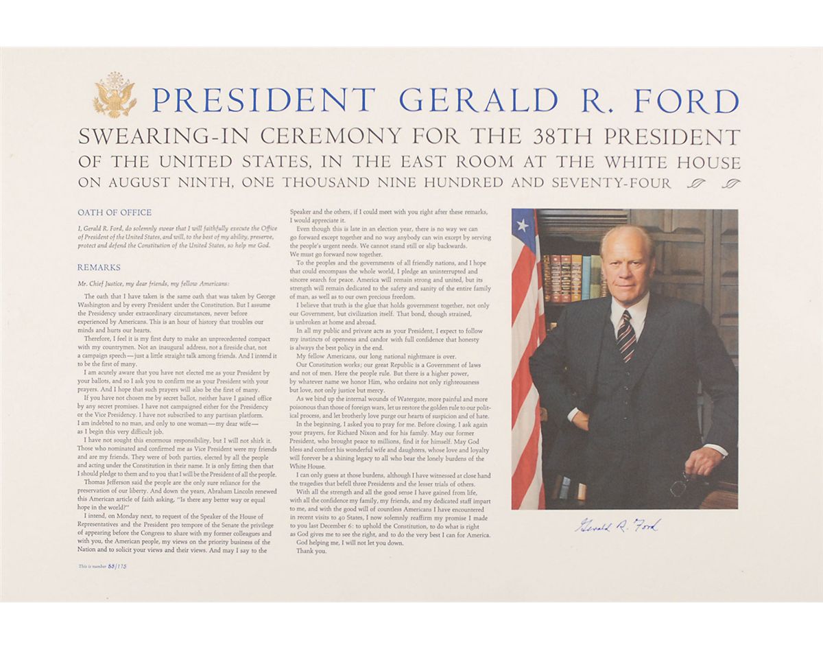 Color limited edition 22 x 15 lithograph broadside, numbered 88/175, bearing Ford’s August 9, 1974, Oath of Office and remarks to the American public, as well as a color image of Ford, signed in blue felt tip, “Gerald R. Ford.” Broadside is removably encapsulated in acid-free Mylar. In very fine condition. At 12:03 p.m. on August 9, 1974, just a half hour after President Nixon’s resignation was made official, Ford took the oath of office in the East Room of the White House, becoming the first president to ever assume the position without being elected.