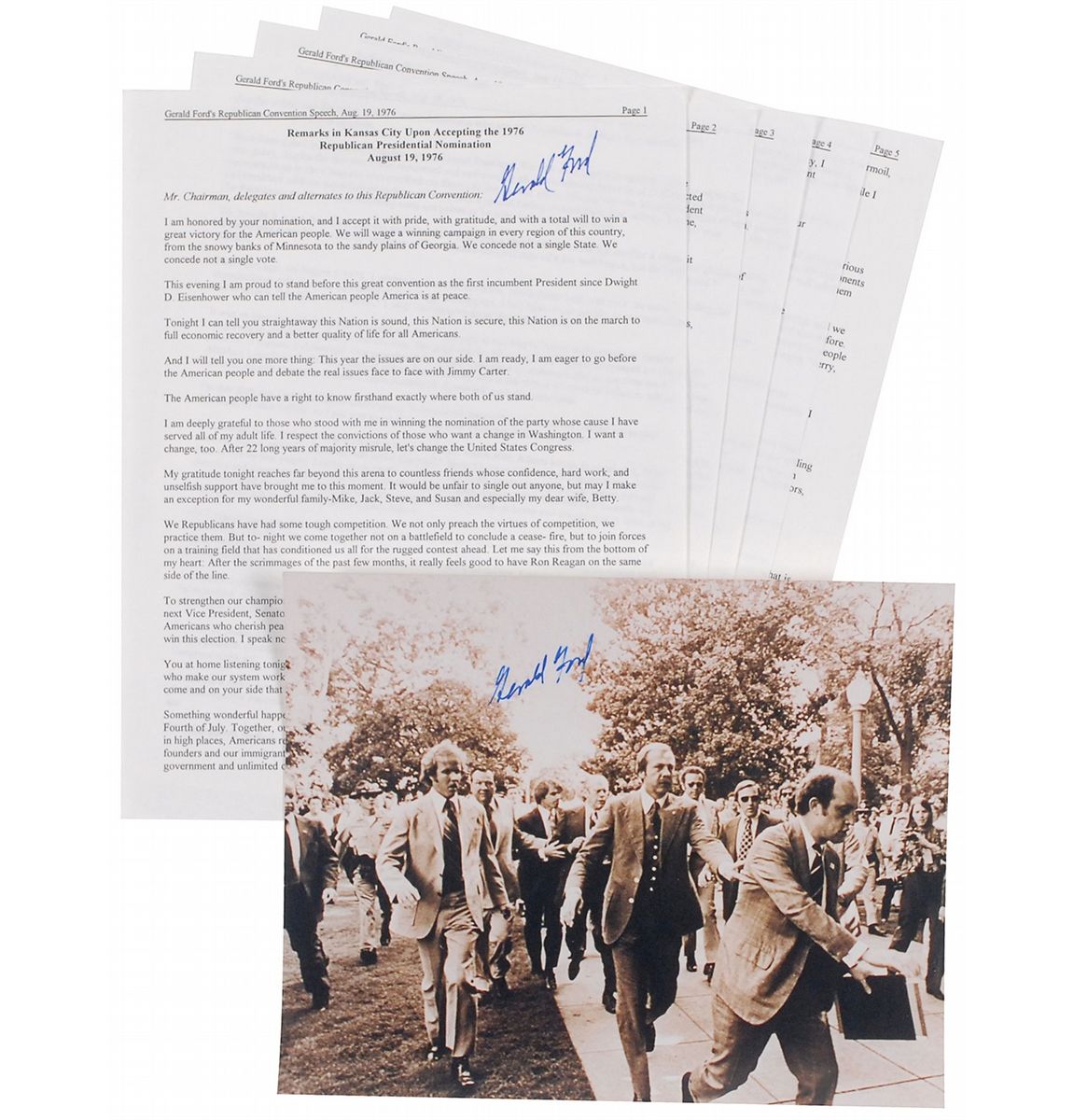 Two items: glossy 10 x 8 photo taken immediately after his second assassination attempt, signed in blue felt tip; and a printed copy of his August 19, 1976, Republican Convention Speech, five pages, 8.5 x 11, signed on the first page in blue felt tip. In fine condition.