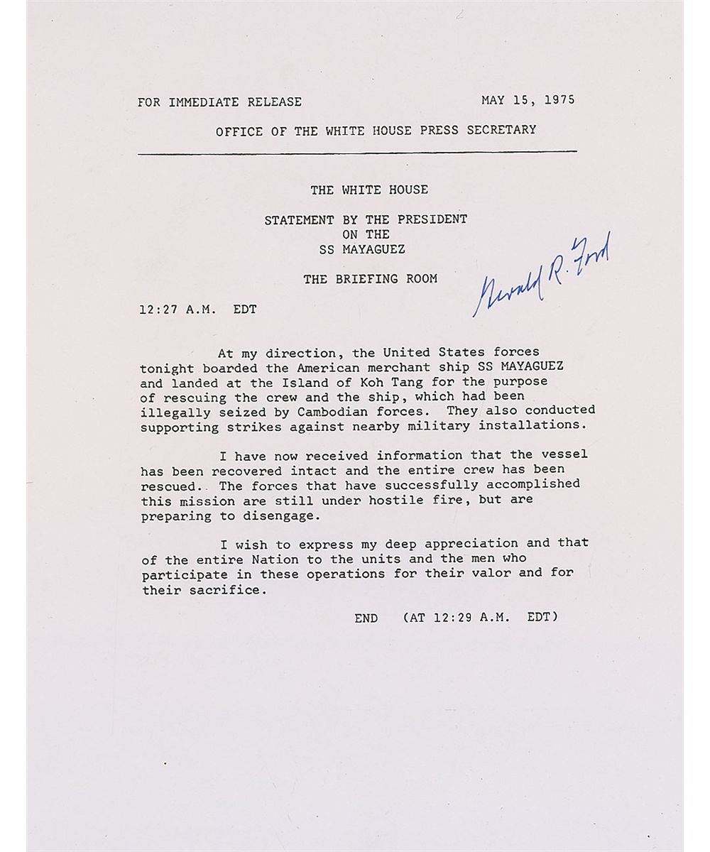 White House press release, one page, 8.5 x 11, dated May 15, 1975, concerning the rescue mission of the crew of the SS Mayaguez which had been seized by Cambodian forces. Signed in blue ink, “Gerald R. Ford.” In fine condition.