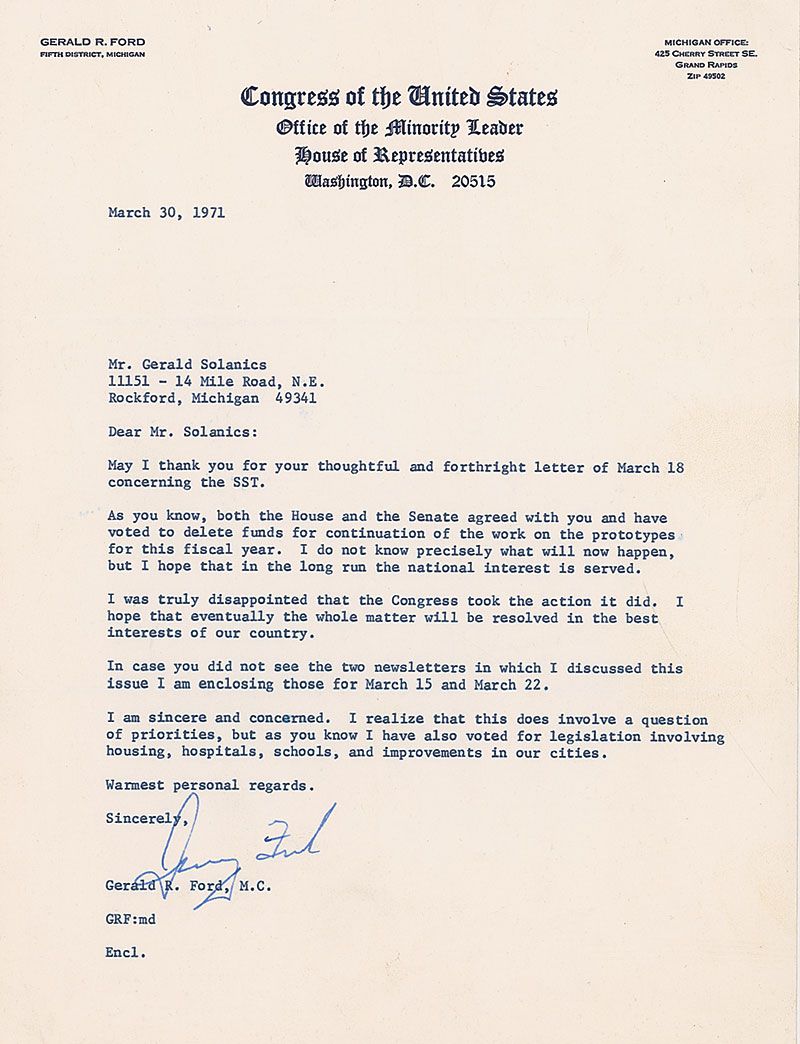 TLS signed “Jerry Ford,” one page, 8 x 10.5, Congress of the United States letterhead, March 30, 1971. Letter to Gerald Solanics. In part: “As you know, both the House and the Senate agreed with you and have voted to delete funds for continuation of the work on the prototypes for this fiscal year. I do not know precisely what will now happen, but I hope that in the long run the national interest is served. I was truly disappointed that the Congress took the action it did. I hope that eventually the whole matter will be resolved in the best interests of our country.” In fine condition. After a decade of work on America’s first supersonic transport (SST), Boeing had still not completed its prototypes for the massive plane and was losing the support of the US government, who had been funding it since Kennedy’s presidency. The project had grown considerably larger than anticipated and was receiving intense negative publicity by the start of the 1970s, and in the spring of 1971, both the House and Senate agreed to cancel the project. Worried about mass unemployment in the aviation sector, Ford had been a strong proponent of the cause, and as shown in this letter, was greatly disappointed by the decision.