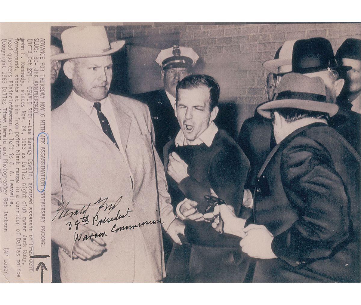 Glossy 9.25 x 7 second generation press photo of Jack Ruby shooting Lee Harvey Oswald on November 24, 1963, signed in black felt tip, “Gerald Ford, 38th President, Warren Commission.” In fine condition.