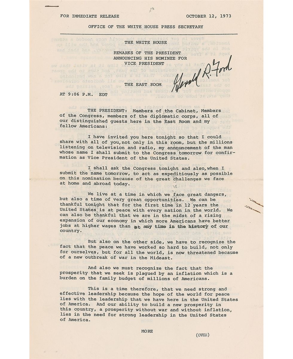 Press release, two pages, 8.5 x 13, dated October 12, 1973, and entitled, “Remarks of the President Announcing His Nominee for Vice President,” and containing Nixon’s and Ford’s comments on his nomination, signed on the first page in black felt tip, “Gerald R. Ford.” In fine condition, with a central horizontal fold and a rusty paperclip mark to right edge.