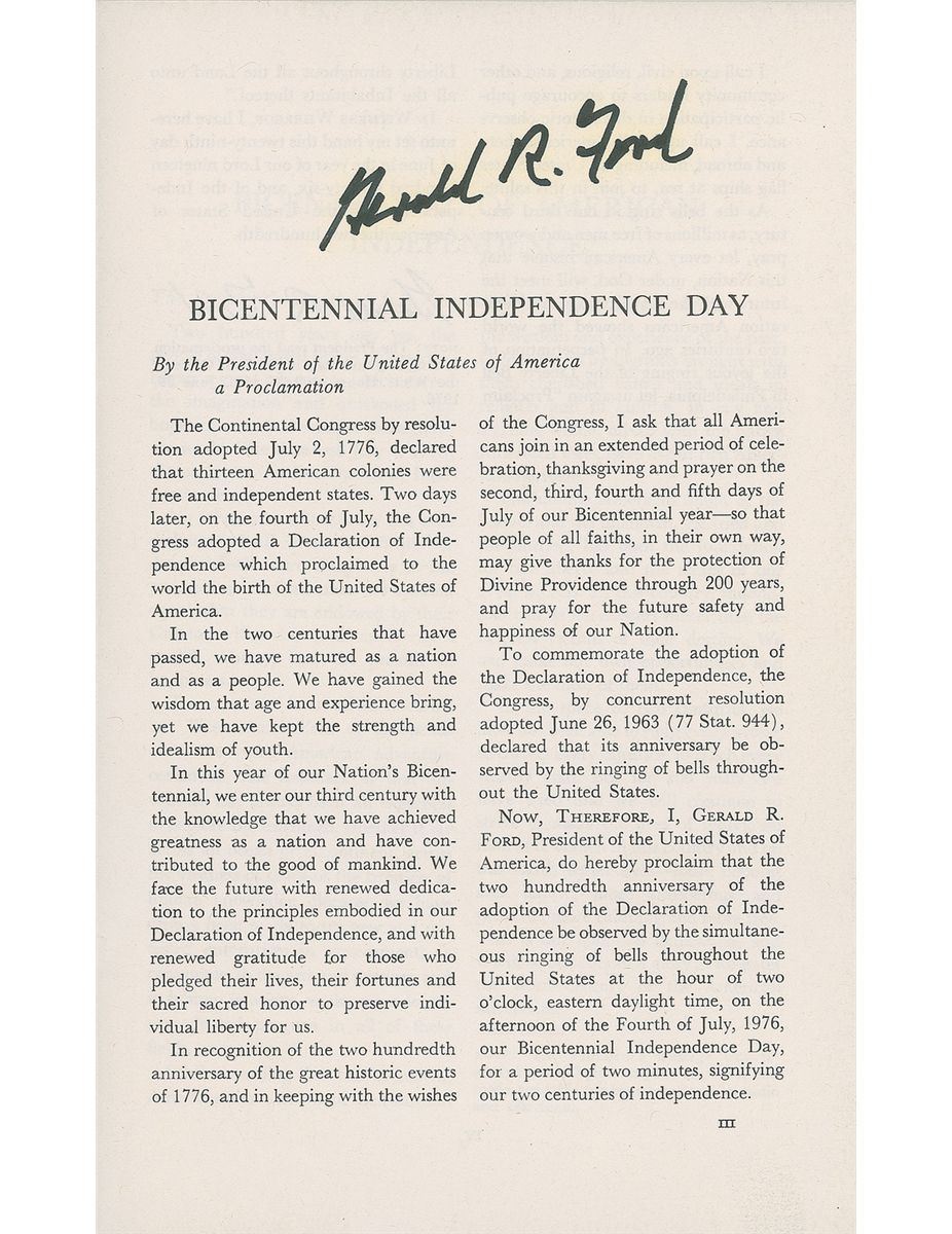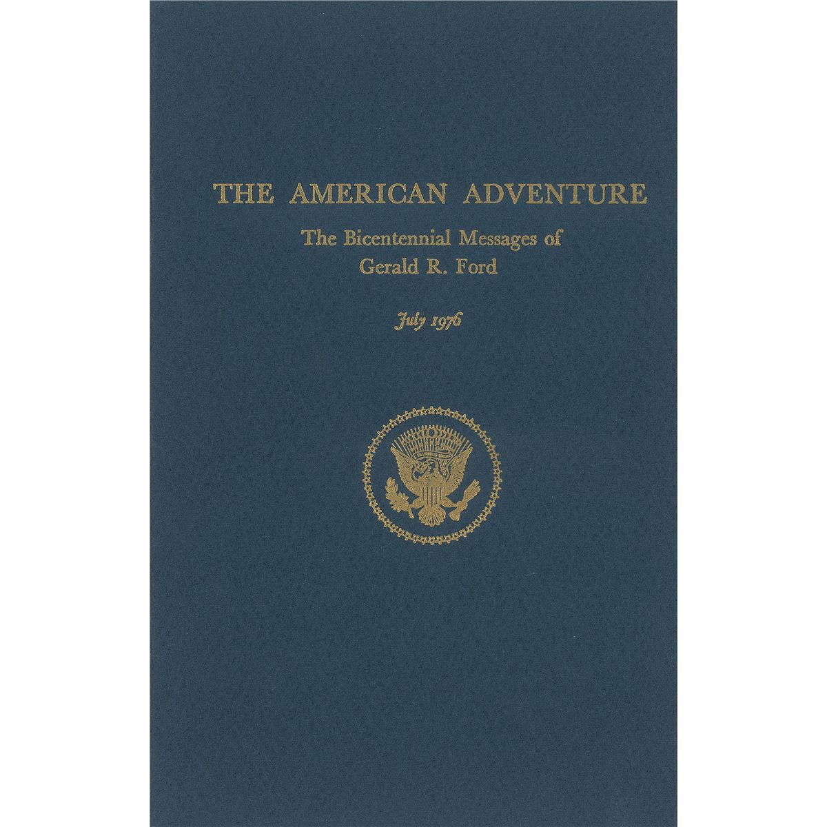 Uncommon booklet entitled The American Adventure: The Bicentennial Messages of Gerald R. Ford, July 1976, 5.75 x9, 28 pages, signed on the first page in black felt tip, “Gerald R. Ford.” In fine condition, with moderate haloing to signature.