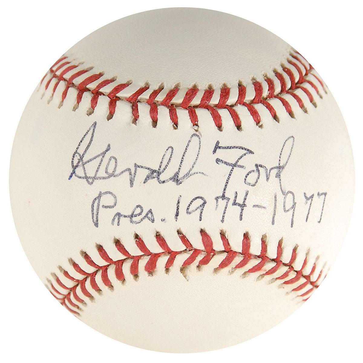 Official Rawlings American League baseball signed in black ballpoint on the sweet spot, “Gerald Ford, Pres. 1974–1977.” In fine condition. A highly desirable example of a presidential baseball with the scarce addition of the years of his term in office.