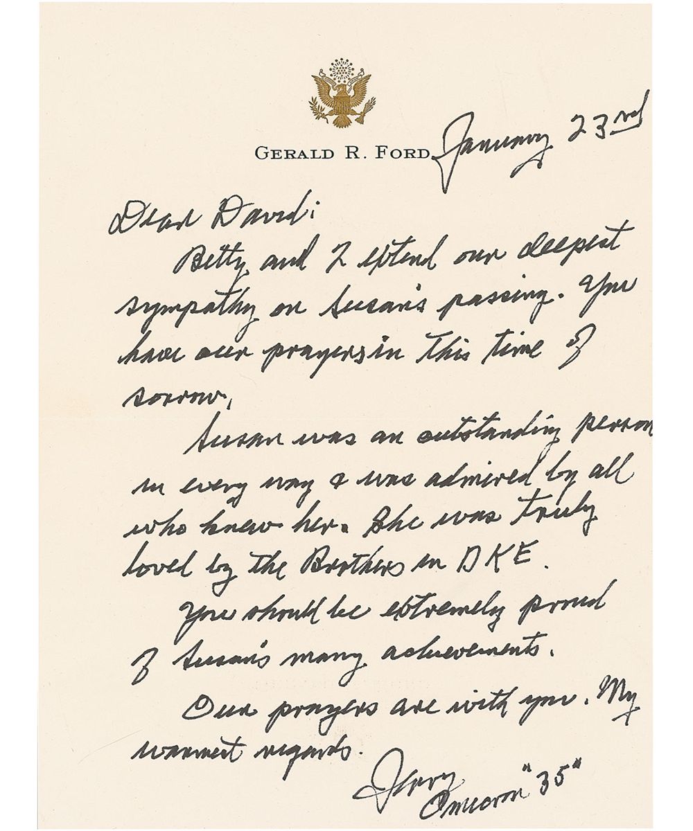 ALS signed “Jerry Omicron ‘35,’” one page, 6.5 x 8.5, personal letterhead, January 23. Letter of condolence to David Easlick, Jr., who spent 25 years as the Executive Director of Delta Kappa Epsilon, a fraternity founded at Yale in 1844. Five presidents have been members of DKE, including Ford. In part: “Betty and I extend our deepest sympathy on Susan’s passing. You have our prayers in this time of sorrow. Susan was an outstanding person in every way & was admired by all who knew her. She was truly loved by the Brothers in DKE. You should be extremely proud of Susan’s many achievements.” In very fine condition. Accompanied by the original mailing envelope, bearing a pre-printed free frank. Omicron is the name of the DKE chapter at the University of Michigan, Ford’s alma mater. A touching letter with a most unusual signature.