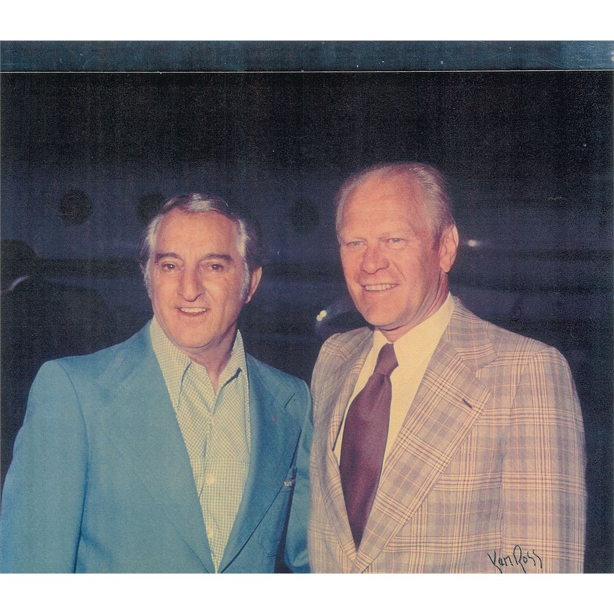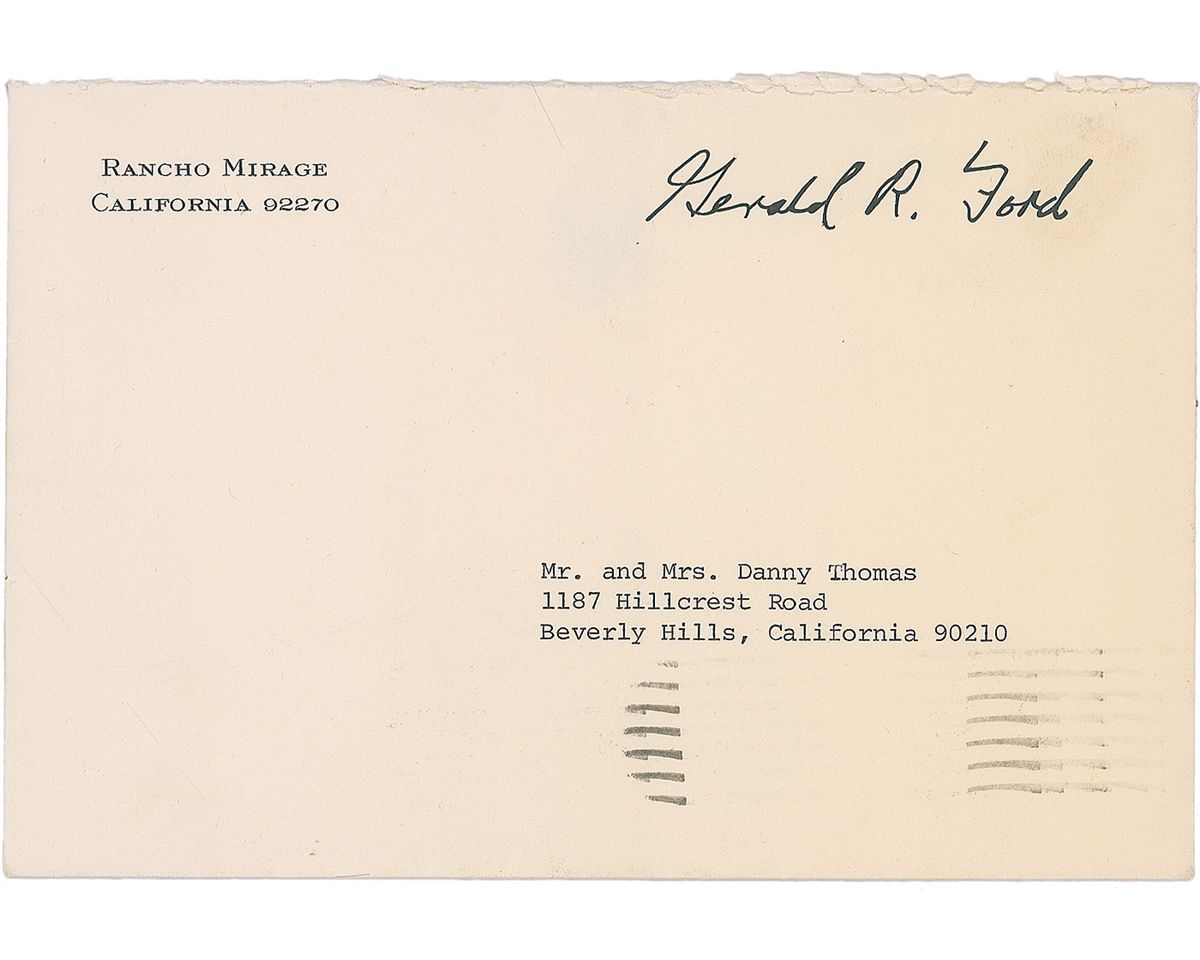 TLS signed “Gerald R. Ford,” one page, 6.25 x 8.5, personal letterhead, January 25, 1982. Letter of thanks to Danny Thomas for a sent gift. In part: “Betty and I sincerely appreciate your thoughtful remembrances at Christmastime. The Cheese pack arrived in time to go with us to Vail so the entire family could enjoy it. They all join us in a warm ‘thank you.’” In fine condition. Accompanied by the original mailing envelope bearing a pre-printed free frank, as well as a color laserprint photo of Ford and Thomas posing together.