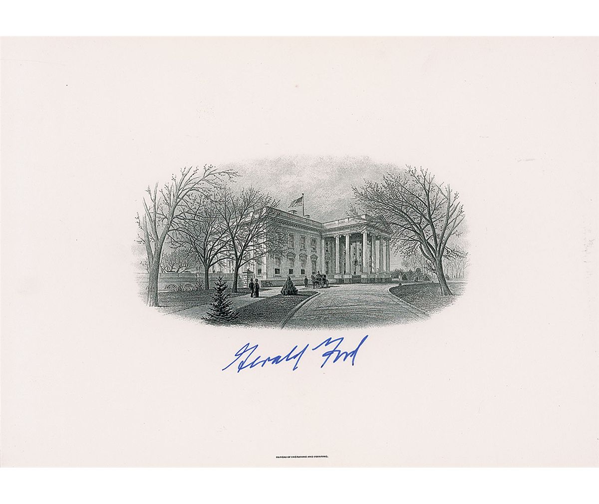 Engraved portrait of the exterior of the White House, 8 x 5.75, by the Bureau of Printing and Engraving, signed under the image in blue felt tip. In very fine condition.