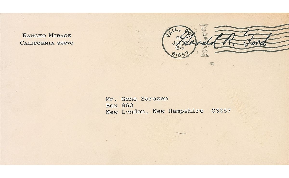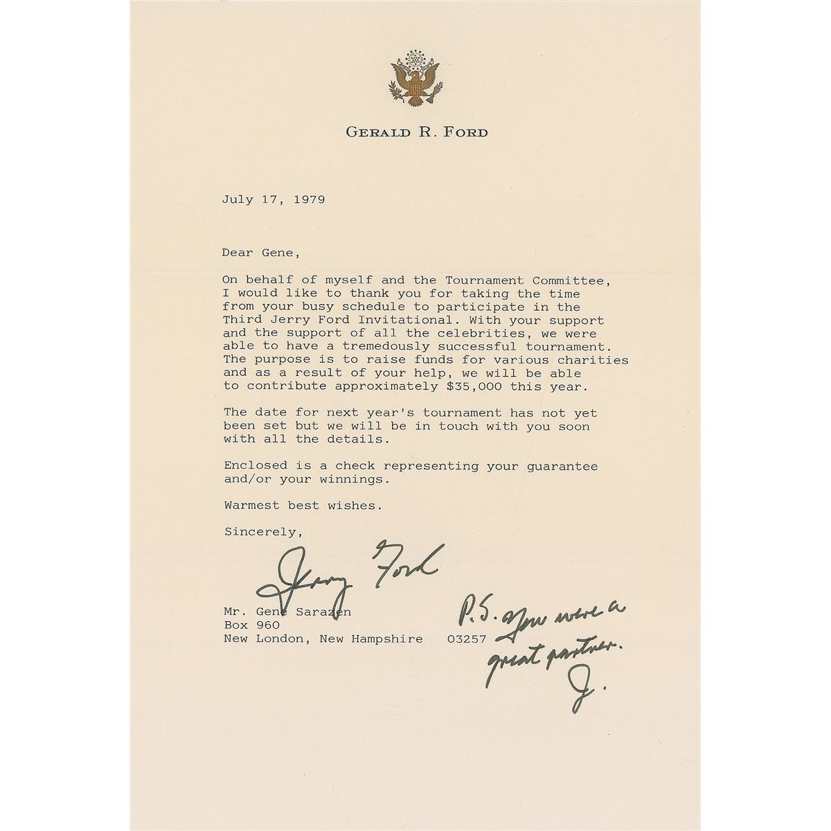 TLS signed “Jerry Ford,” one page, 7.25 x 10.5, personal letterhead, July 17, 1979. Letter to golf legend Gene Sarazen. In part: “I would like to thank you for taking the time…to participate in the Third Jerry Ford Invitational. With your support and the support of all the celebrities, we were able to have a tremendously successful tournament.” He adds a handwritten postscript signed with an initial, “J.,” in full: “P.S. You were a great partner.” In fine condition. Accompanied by the original mailing envelope, bearing a pre-printed free frank. In the tournament, Ford was paired with Sarazen, actor George C. Scott, and football player Dick Anderson.