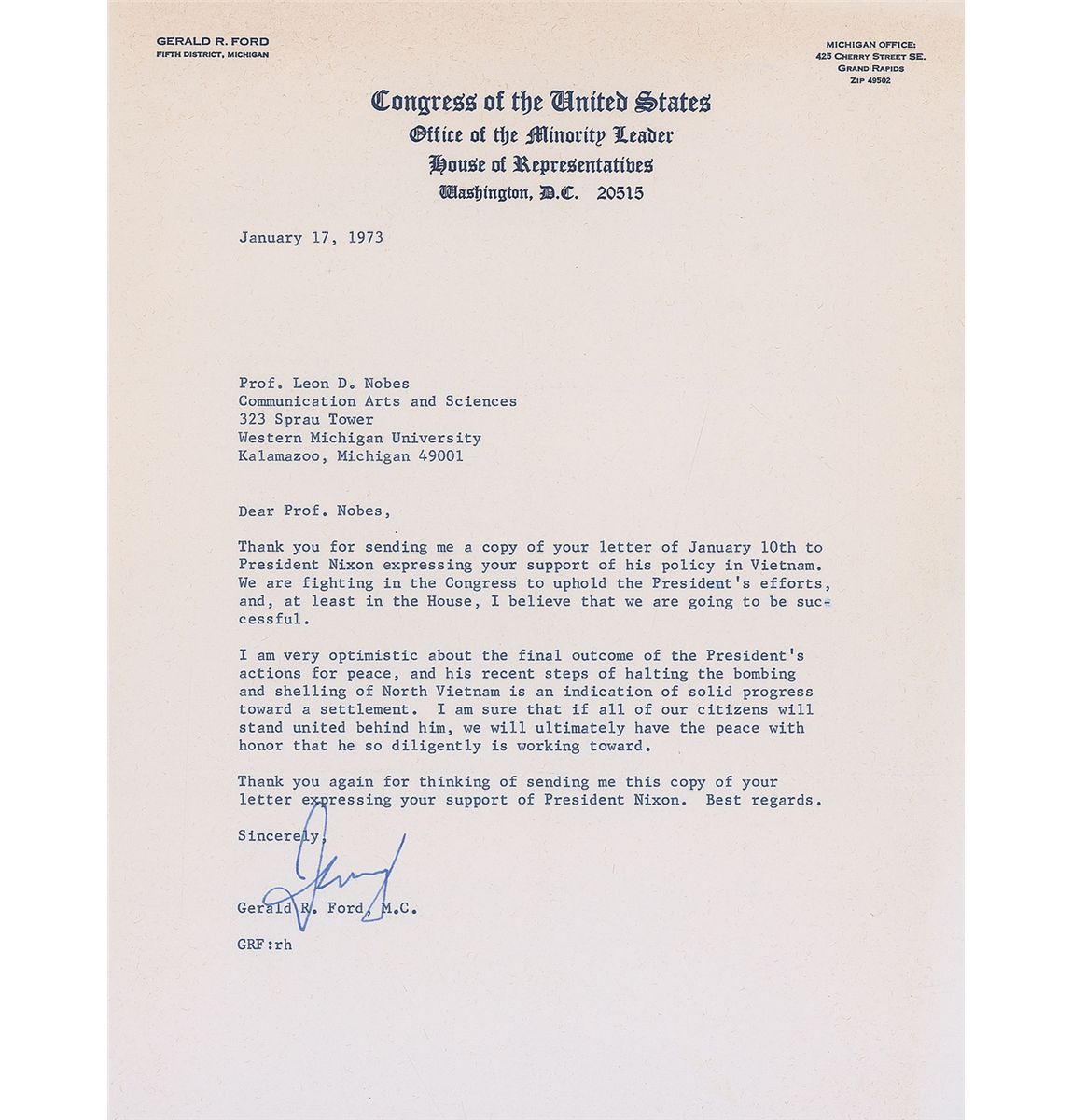 TLS signed “Jerry,” one page, 8 x 10.5, Congress of the United States letterhead, January 17, 1973. Letter to Professor Leon D. Nobes at Western Michigan University. In part: “Thank you for sending me a copy of your letter…to President Nixon expressing your support of his policy in Vietnam. We are fighting in the Congress to uphold the President’s efforts, and, at least in the House, I believe that we are going to be successful. I am very optimistic about the final outcome of the President’s actions for peace, and his recent steps of halting the bombing and shelling of North Vietnam is an indication of solid progress toward a settlement. I am sure that if all of our citizens will stand united behind him, we will ultimately have the peace with honor that he so diligently is working toward.” In fine condition, with mild toning to the top.