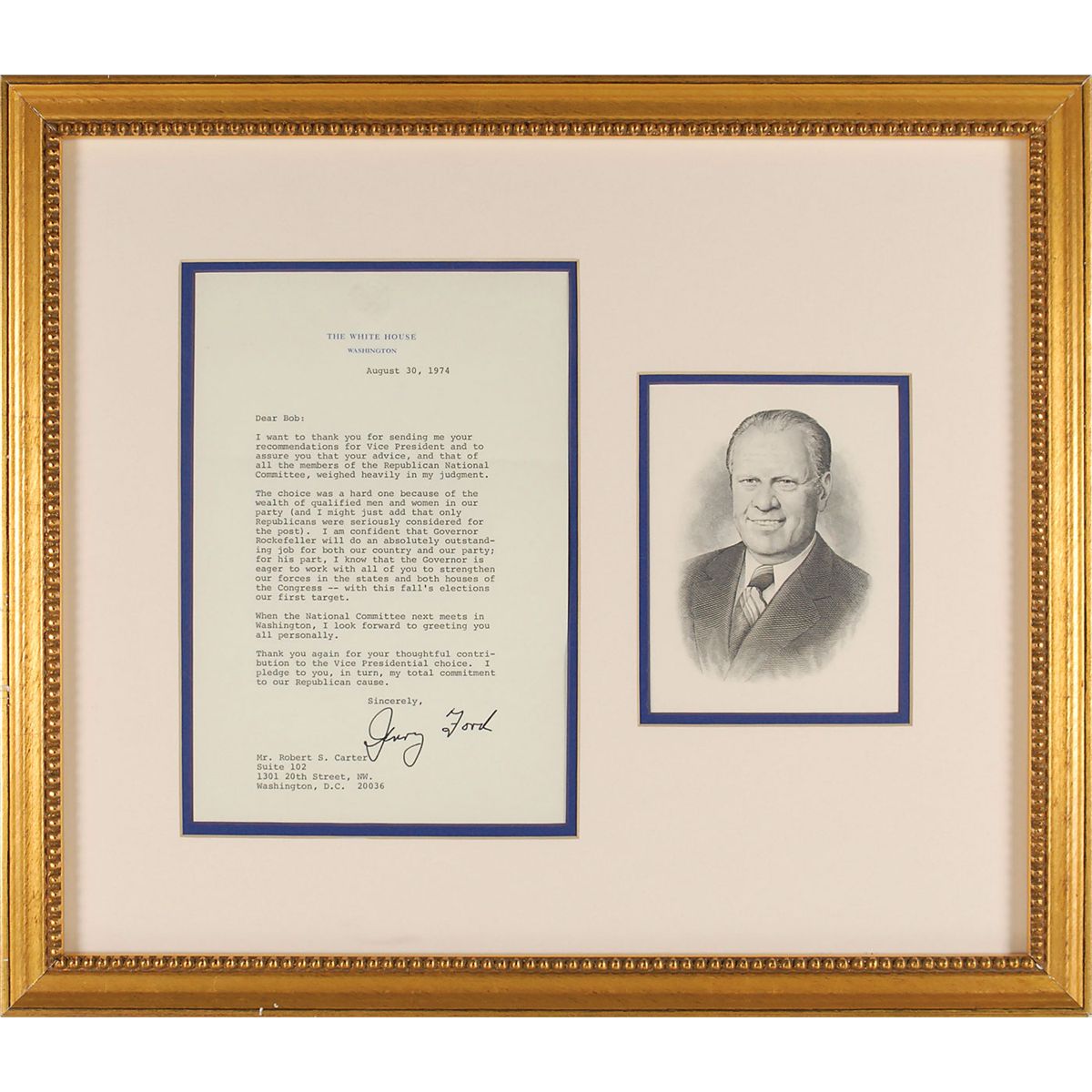 TLS as president signed “Jerry Ford,” one page, 6.5 x 9.75, White House letterhead, August 30, 1974. Letter to Robert S. Carter. In part: “I want to thank you for sending me your recommendations for Vice President and to assure you that your advice, and that of all the members of the Republican National Committee, weighed heavily in my judgment. The choice was a hard one because of the wealth of qualified men and women in our party (and I might just add that only Republicans were seriously considered for the post). I am confident that Governor Rockefeller will do an absolutely outstanding job for both our country and our party.” Double-matted and framed with an engraved portrait to an overall size of 19.25 x 16.75. In fine condition. Ford had just ascended to the presidency on August 9 after Nixon’s resignation, and he nominated Nelson Rockefeller to fill the vacated vice presidency on August 20. George Bush was the other top contender to fill the position, and Rockefeller was an unpopular choice—the nomination stalled in extended Congressional hearings, and his appointment to the vice presidency was finally approved on December 19, 1974.