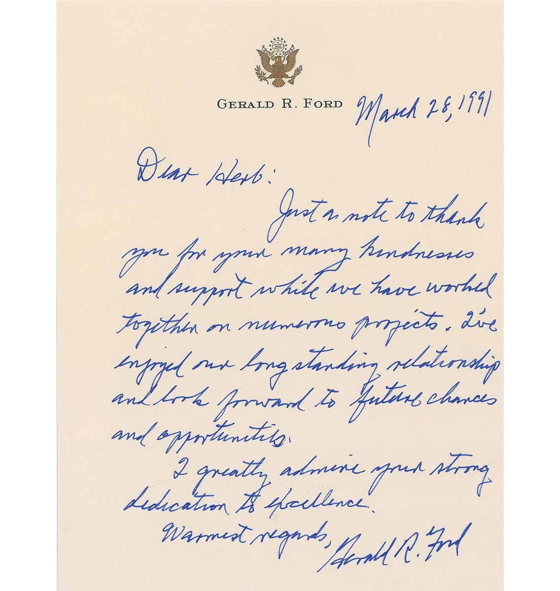 ALS signed “Gerald R. Ford,” one page, 6.25 x 8.5, personal letterhead, March 28, 1991. A letter of thanks to a supporter, in part: “Just a note to thank you for your many kindnesses and support while we have worked together on numerous projects. I’ve enjoyed our long-standing relationship and look forward to future chances and opportunities.” In fine condition. From the collection of noted publisher and founder of Lord John Press, Herb Yellin.