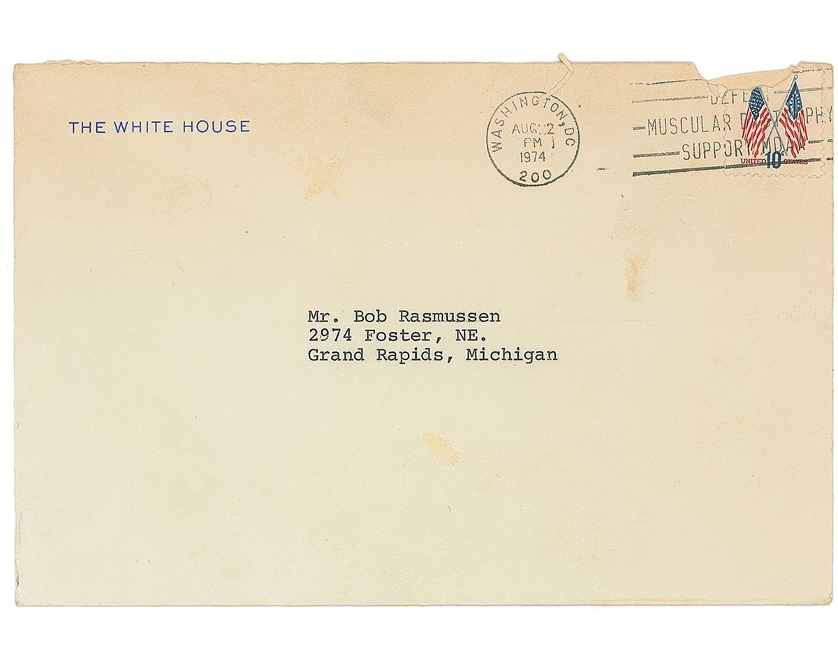 TLS as president signed “Jerry Ford,” one page, 6.75 x 8.75, White House letterhead, August 21, 1974. Letter to Bob Rasmussen, in full: “Thanks so much for your very kind and thoughtful message of congratulations. The support and encouragement of my friends in Grand Rapids are especially welcome and strengthen my determination to bring about an America united in the goal of achieving lasting peace and prosperity.” Ford has handwritten “Bob” over the original formal salutation. In fine condition. Accompanied by the original mailing envelope. Ford had been sworn in immediately following Nixon’s resignation on August 9, 1974, less than two weeks before this letter was written.