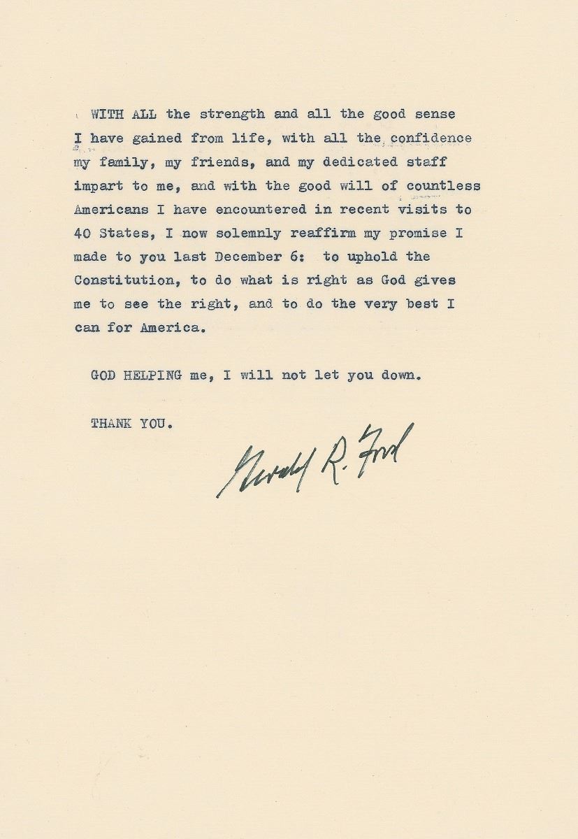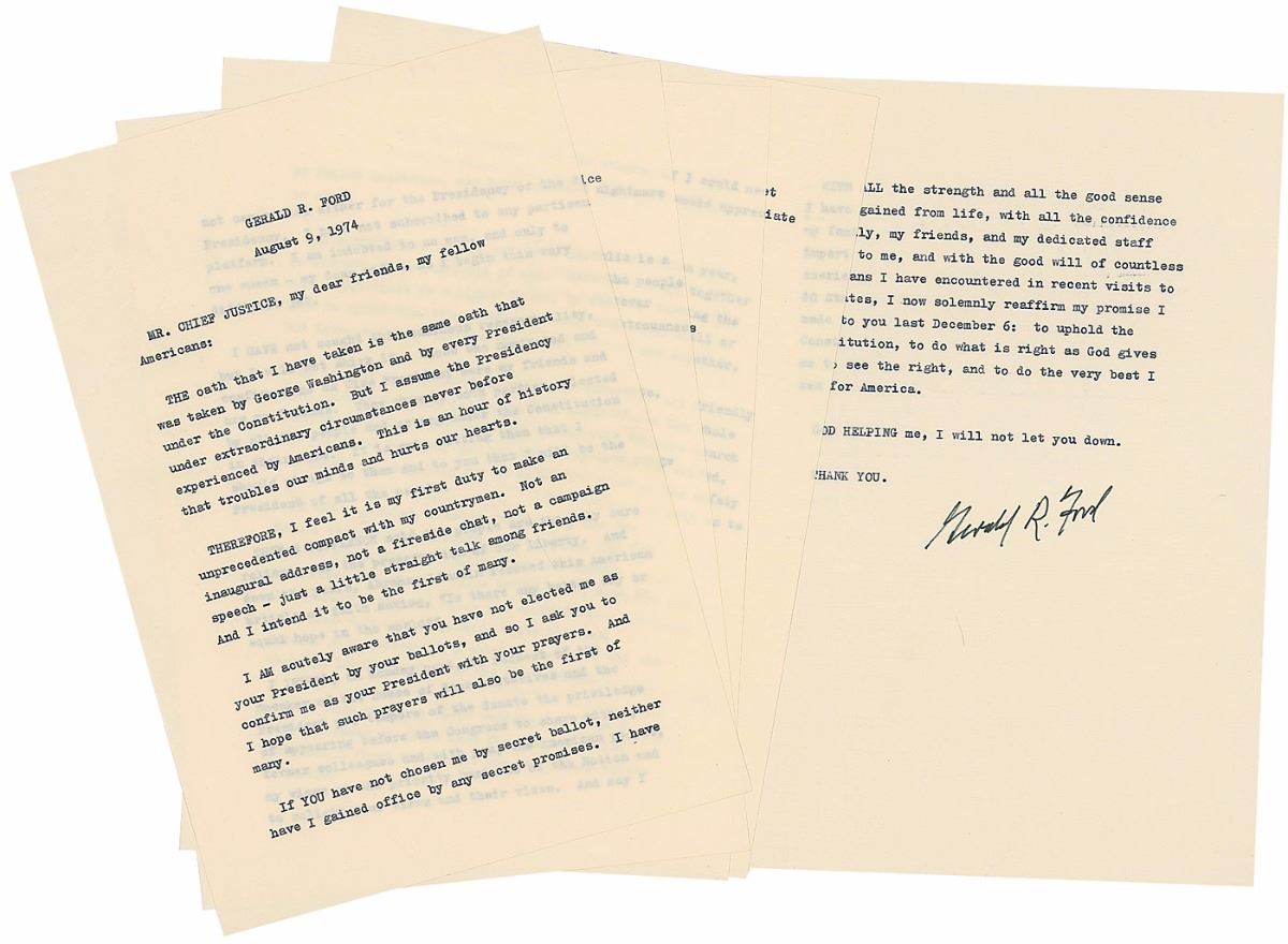 Souvenir typescript, five pages, 7.25 x 10.5, signed at the conclusion in black felt tip, “Gerald R. Ford.” Ford’s inaugural statement given on August 9, 1974. In part: “I am acutely aware that you have not elected me as President by your ballots, and so I ask you to confirm me as your President with your prayers. And I hope that such prayers will also be the first of many.” In fine condition.