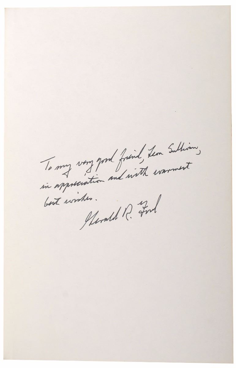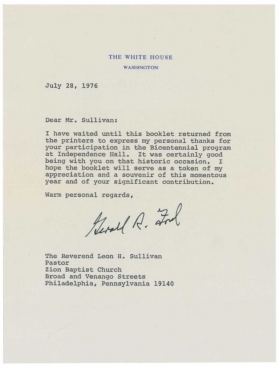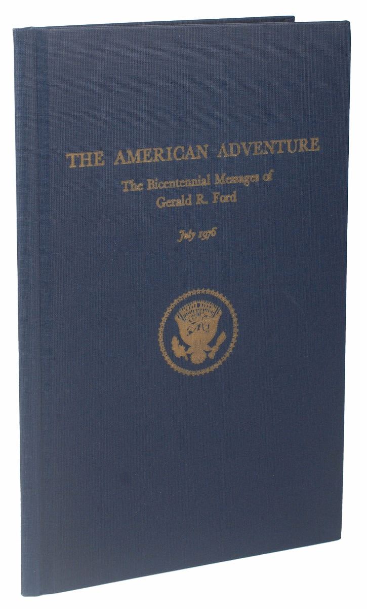 Two items: a hardcover edition of The American Adventure: The Bicentennial Messages of Gerald R. Ford, 6 x 9.25, 29 pages, signed and inscribed on the first free end page in black felt tip, “To my very good friend, Leon Sullivan, in appreciation and with warmest best wishes, Gerald R. Ford”; and a TLS as president, one page, 6.75 x 9, White House letterhead, July 28, 1976, in part: “I have waited until this booklet returned from the printers to express my personal thanks for your participation in the Bicentennial program at Independence Hall.” In overall fine condition.