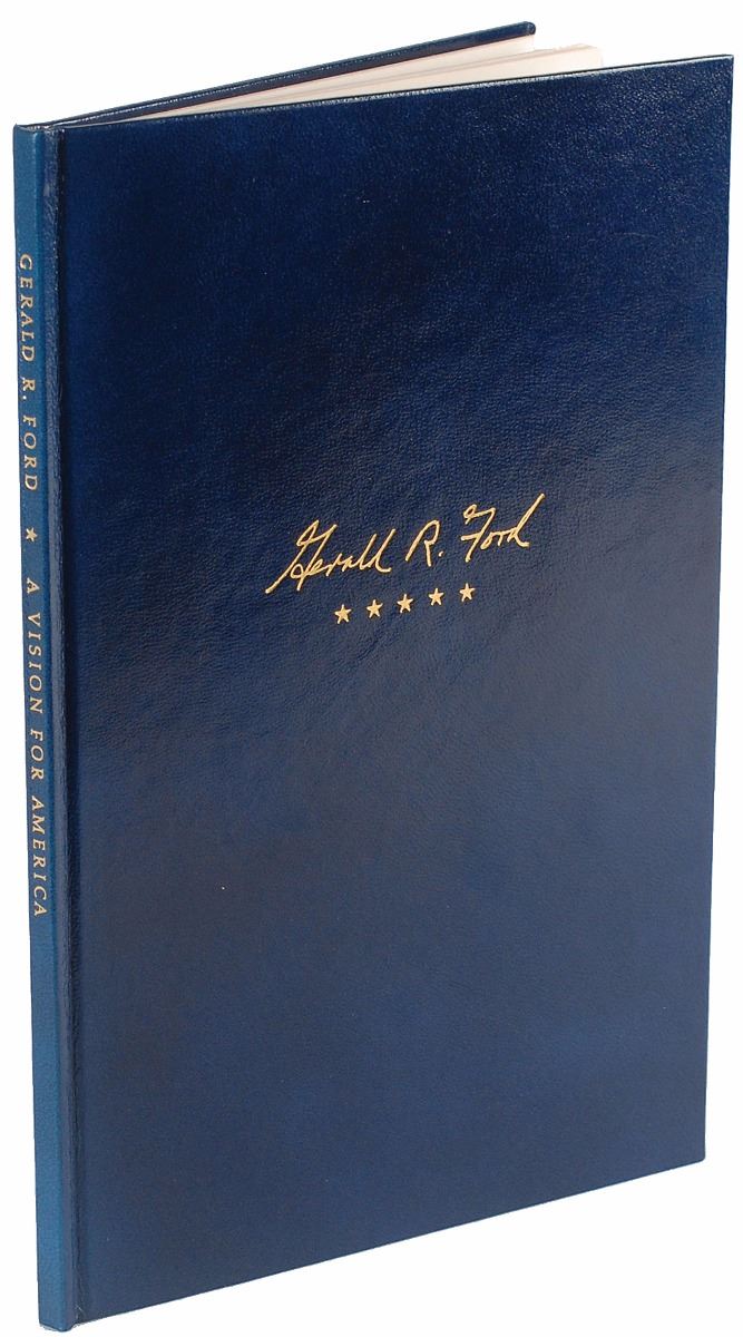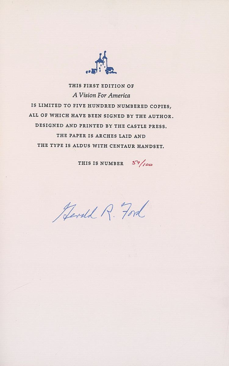Signed book: A Vision for America. First edition, limited issue, numbered 57/100. Northridge, California: Lord John Press, 1980. Hardcover with slipcase, 6.5 x 10, 9 pages. Signed on the colophon in blue ballpoint, “Gerald R. Ford.” In fine condition, with a noticeable odor to the book and sunning to the slipcase.