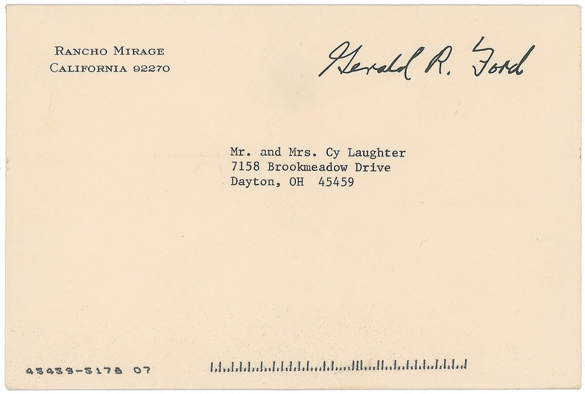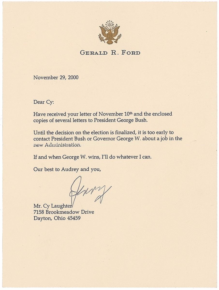TLS signed “Jerry,” one page, 6.25 x 8.5, personal letterhead, November 29, 2000. Letter concerning the contested presidential election of 2000. In part: “Until the decision on the election is finalized, it is too early to contact President Bush or Governor George W. about a job in the new Administration. If and when George W. wins, I’ll do whatever I can.” In fine condition. Accompanied by the original mailing envelope, bearing a pre-printed free frank, as well as a GOP observer Miami-Dade badge. The election between Democrat Al Gore and Republican George W. Bush came down to the state of Florida, where Bush’s slim margin of victory triggered a recount. However, the Supreme Court brought the recount to a halt in the controversial Bush v. Gore decision and awarded the presidency to Bush. Shortly thereafter on January 30, 2001, former presidents Ford and Carter were named honorary co-chairmen of the National Commission on Federal Election Reform.