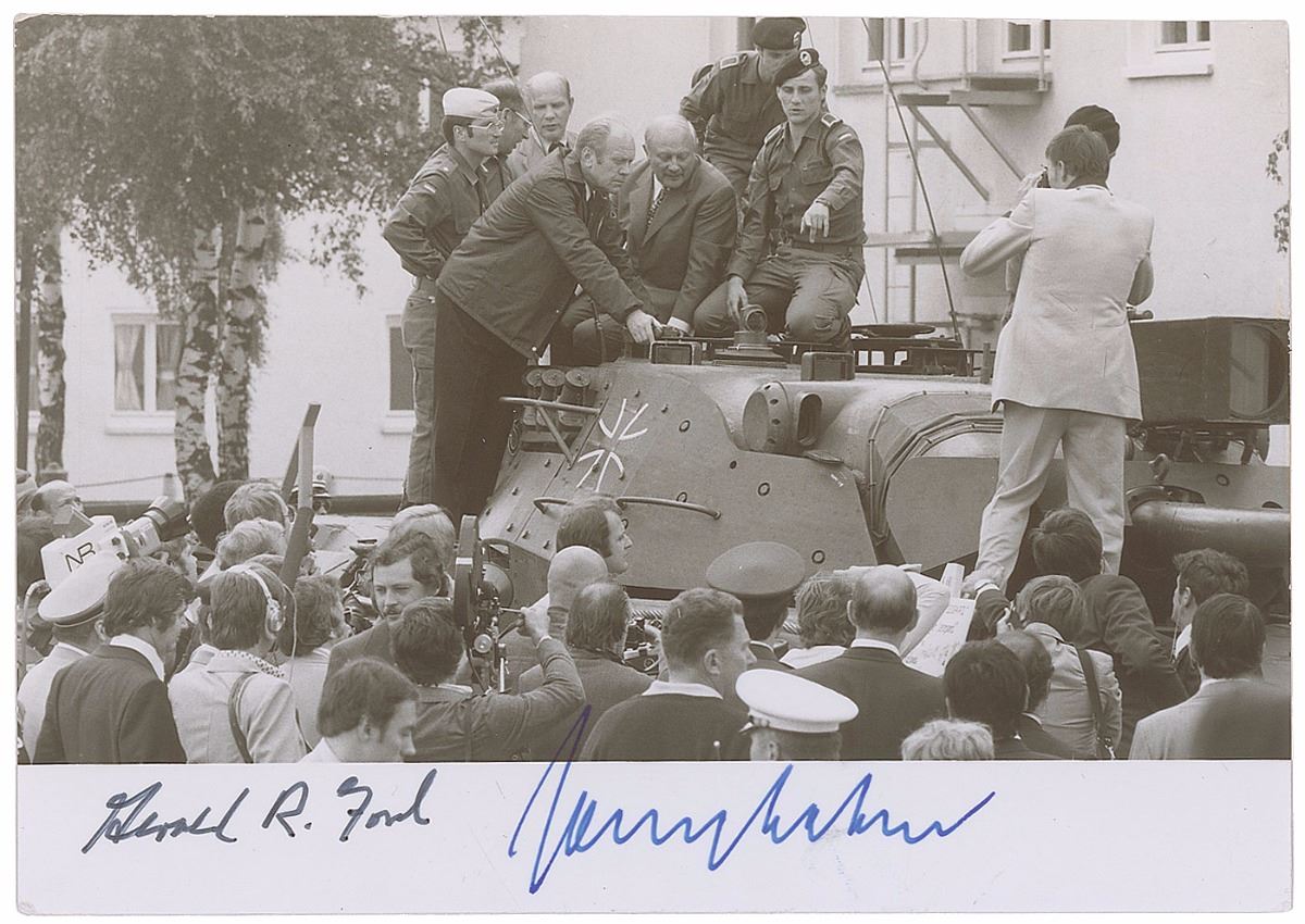 Matte-finish 7 x 4.75 photo of President Gerald Ford and former German Defense Secretary Georg Leber inspecting a German Leopard tank during festivities at a woodland picnic in Kirchgons, Germany, on July 26, 1975, signed in the lower border in black felt tip, “Gerald R. Ford,” and in blue felt tip, “Georg Leber.” In fine condition, with trivial edgewear.