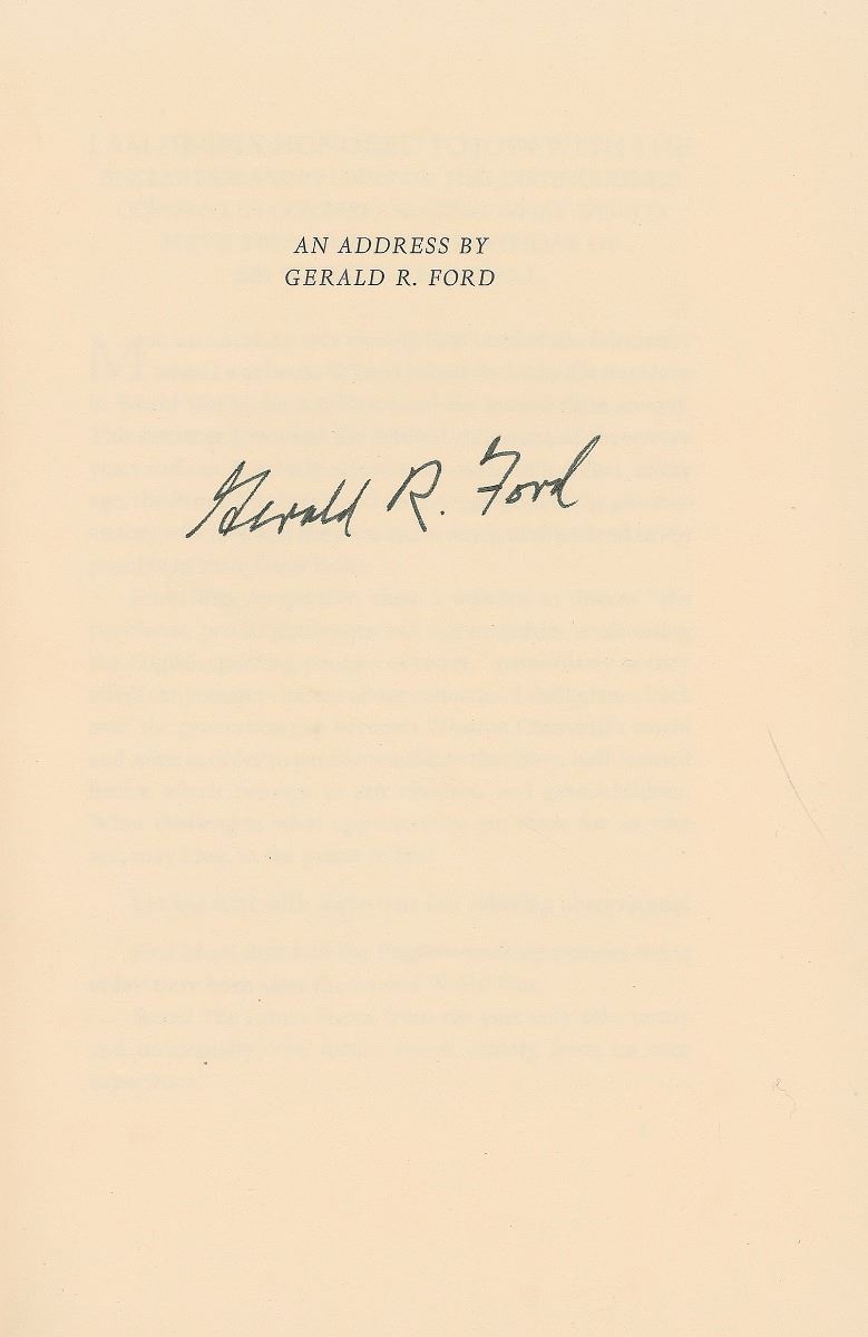 Signed book: Churchill Lecture. Limited first edition, unnumbered designer’s copy. Northridge, CA: Lord John Press, 1984. Hardcover, 6.5 x 9.5, 17 pages. Signed on the half-title page in black ink, “Gerald R. Ford.” In fine condition.