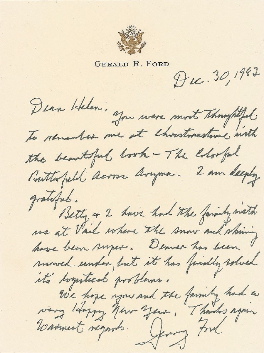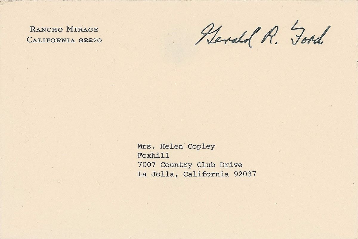 Uncommon ALS signed “Jerry Ford,” one page, 6.25 x 8.5, personal letterhead, December 30, 1982. Letter to Helen Copley, head of The Copley Press, in part: “You were most thoughtful to remember me at Christmastime with the beautiful book—The Colorful Butterfield Across Arizona [sic]. I am deeply grateful. Betty & I have had the family with us at Vail where the snow and skiing have been super. Denver has been snowed under, but it has finally solved its logistical problems. We hope you and the family had a very Happy New Year.” In fine condition. Accompanied by the original mailing envelope bearing a pre-printed free frank, and a softcover copy of The Butterfield Overland Stage Across Arizona. A desirable, seldom-seen format of the 38th president. Helen Copley was head of San Diego’s Union Tribune Publishing Company and the chairman and CEO of the Copley Press, a publisher and newspaper chain comprising 15 daily and 32 weekly publications.
