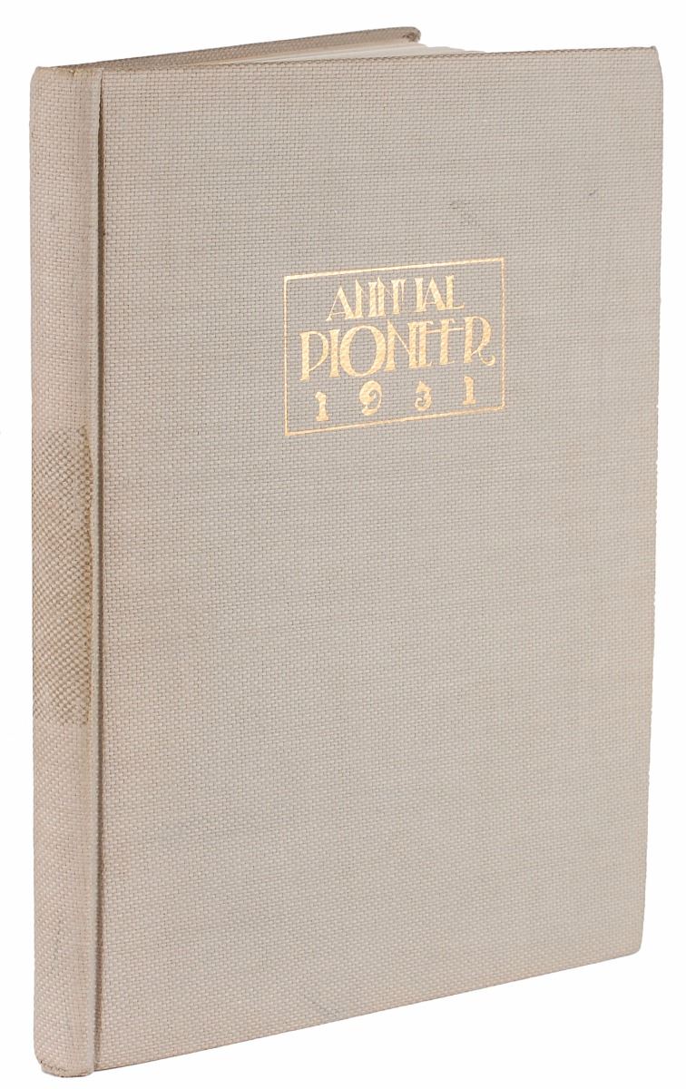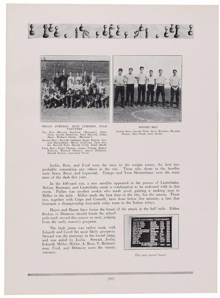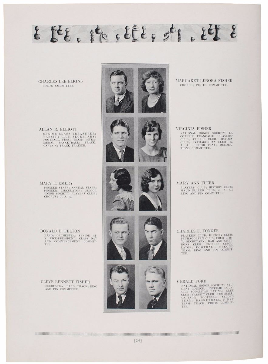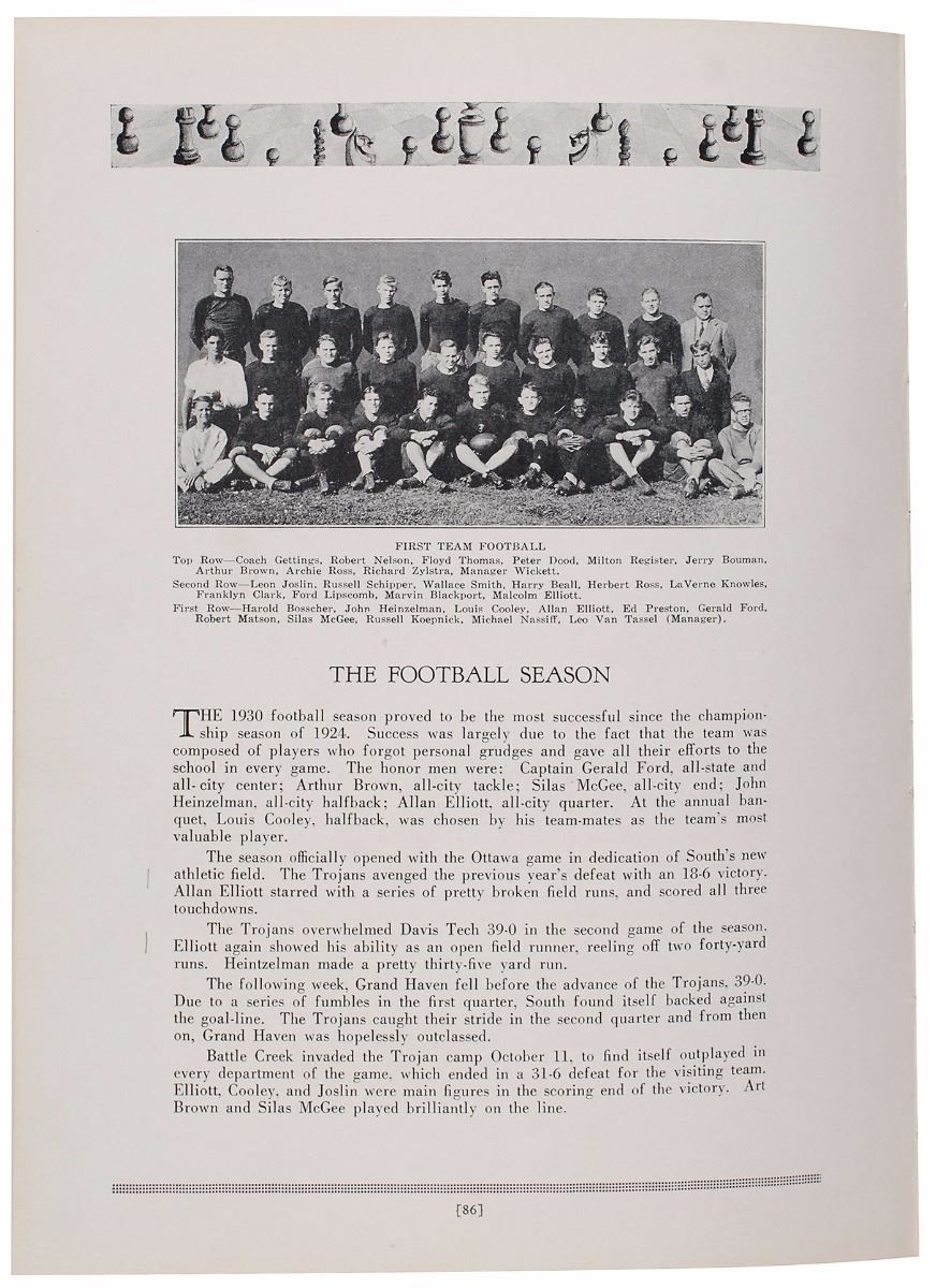 South High School of Grand Rapids Michigan 1931 The Pioneer Annual yearbook, 8 x 10.75, 172 pages, featuring Ford’s unsigned senior yearbook picture on page 24, listing his activities: National Honor Society, student council, inter-hi council, sodalitas latina, glee club, varsity club, football captain, second team football, first team basketball, track, and photo committee. Ford is pictured or listed eight more times in the yearbook as well. On page 41 the Senior Committee credits Ford with “Photo”; on page 86 as an all-state and all-city center of the football team; on page 89 as a member of the basketball team; on pages 92 and 93 as a member of the track and weight teams; on page 116 as a member of the student council; on page 118 as a member of the varsity club; and on page 123 as a member of the Latin club. The half-title page features several alumni signatures presumably signed at a class reunion in 1959. In fine condition, with some surface marks to covers and traces of label remnants to spine.