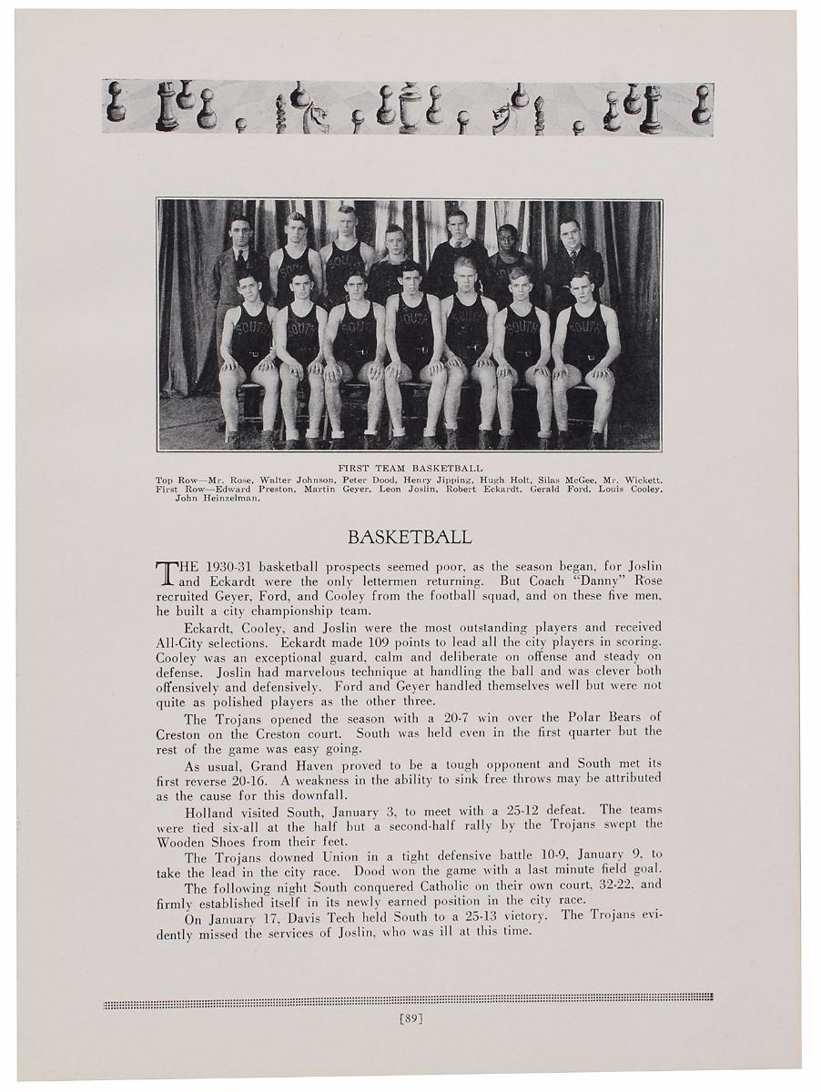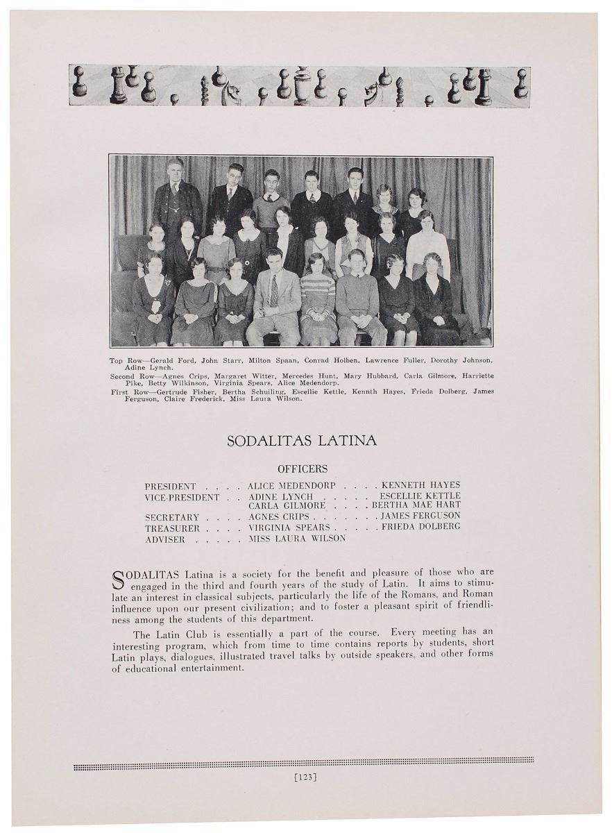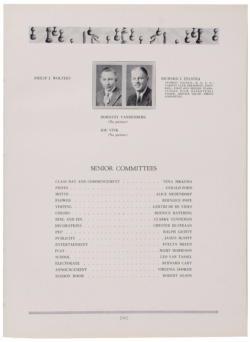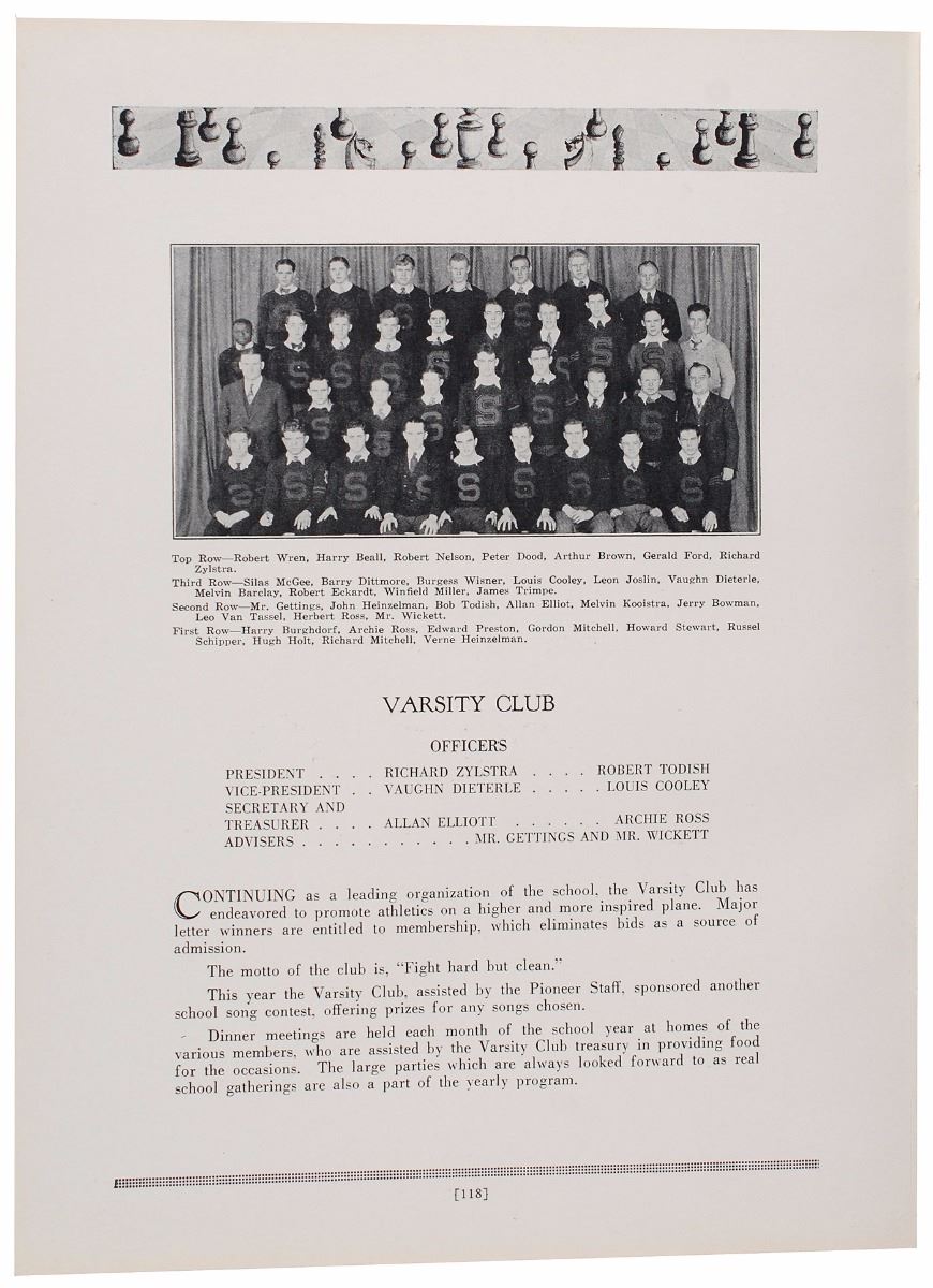 South High School of Grand Rapids Michigan 1931 The Pioneer Annual yearbook, 8 x 10.75, 172 pages, featuring Ford’s unsigned senior yearbook picture on page 24, listing his activities: National Honor Society, student council, inter-hi council, sodalitas latina, glee club, varsity club, football captain, second team football, first team basketball, track, and photo committee. Ford is pictured or listed eight more times in the yearbook as well. On page 41 the Senior Committee credits Ford with “Photo”; on page 86 as an all-state and all-city center of the football team; on page 89 as a member of the basketball team; on pages 92 and 93 as a member of the track and weight teams; on page 116 as a member of the student council; on page 118 as a member of the varsity club; and on page 123 as a member of the Latin club. The half-title page features several alumni signatures presumably signed at a class reunion in 1959. In fine condition, with some surface marks to covers and traces of label remnants to spine.