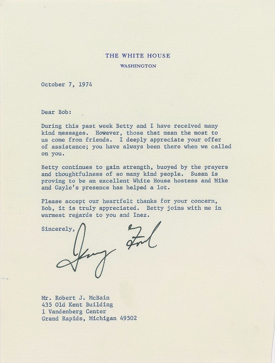 TLS as president signed “Jerry Ford,” one page, 6.75 x 8.75, White House letterhead, October 7, 1974. Letter to Robert McBain, in part: “During this past week Betty and I have received many kind messages. However, those that mean the most to us come from friends. I deeply appreciate your offer of assistance; you have always been there when we called on you. Betty continues to gain strength, buoyed by the prayers and thoughtfulness of so many kind people. Susan is proving to be an excellent White House hostess and Mike and Gayle’s presence has helped a lot.” In fine condition. Accompanied by the original mailing envelope. On September 28, 1974, just weeks after becoming the first lady, Betty Ford underwent a mastectomy upon discovering she had breast cancer. Her braveness and transparency concerning the disease raised breast cancer awareness and prompted more women to self-examine.