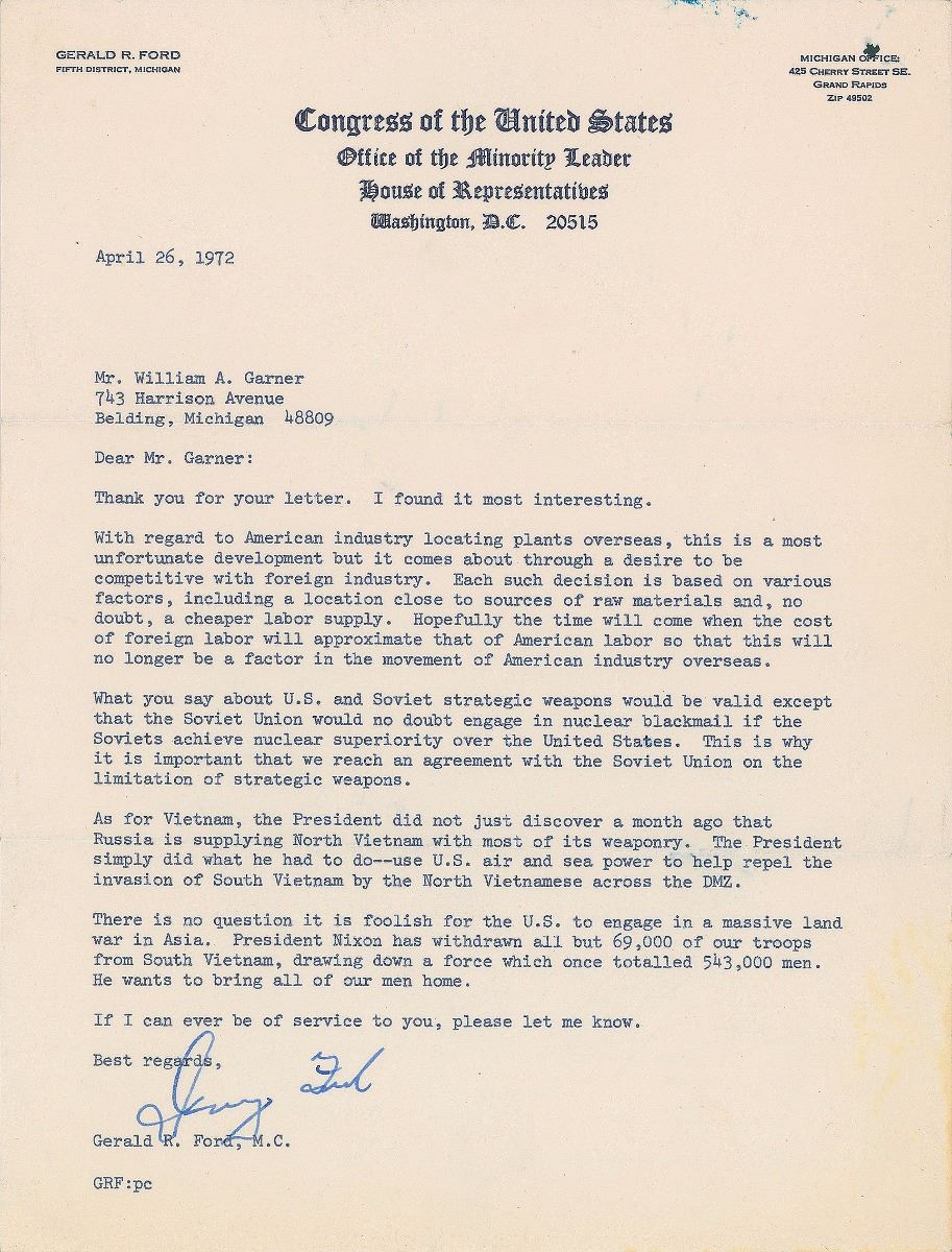 Fascinating TLS signed “Jerry Ford,” one page, 8 x 10.5, Congress of the United States, Office of the Minority Leader letterhead, April 26, 1972. Letter to William Garner, in part: “With regard to American industry locating plants overseas, this is a most unfortunate development but it comes about through a desire to be competitive with foreign industry…Hopefully the time will come when the cost of foreign labor will approximate that of American labor so that this will no longer be a factor in the movement of American industry overseas. What you say about U.S. and Soviet strategic weapons would be valid except that the Soviet Union would no doubt engage in nuclear blackmail if the Soviets achieve nuclear superiority over the United States. This is why it is important that we reach an agreement with the Soviet Union on the limitation of strategic weapons. As for Vietnam, the President did not just discover a month ago that Russia is supplying North Vietnam with most of its weaponry. The President simply did what he had to do—use U.S. air and sea power to help repel the invasion of South Vietnam by the North Vietnamese across the DMZ. There is no question it is foolish for the U.S. to engage in a massive land war in Asia. President Nixon has withdrawn all but 69,000 of our troops from South Vietnam, drawing down a force which once totalled 543,000 men. He wants to bring all of our men home.” In fine condition.