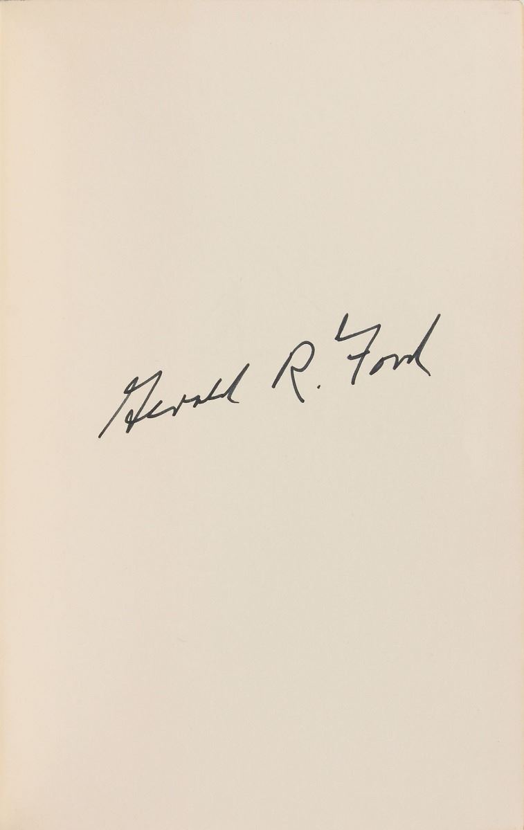 Signed book: Portrait of the Assassin. First edition, first printing. NY: Simon & Schuster, 1965. Hardcover with dust jacket, 6 x 8.5, 508 pages. Signed on the first free end page in black felt tip, “Gerald R. Ford.” In fine condition.
