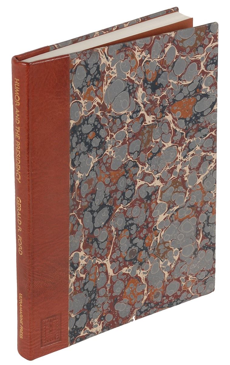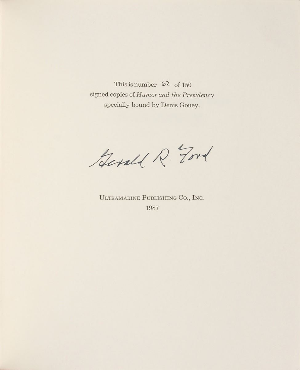 Two limited first edition books, both signed “Gerald R. Ford,” including: a copy of Humor and the Presidency, numbered 62/150, signed on the colophon in black ink; and a copy of the miniature book Global Stability, numbered 70/400, signed on the colophon in blue ballpoint. In overall fine condition.