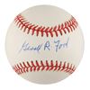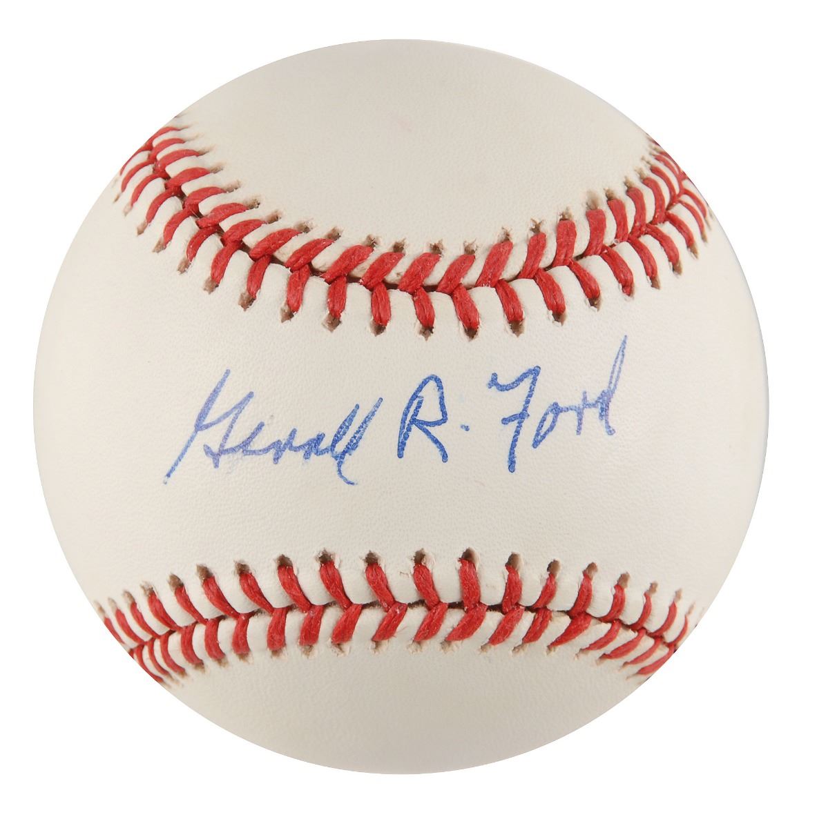 Official Rawlings American League (Brown) baseball signed in blue ballpoint on the sweet spot, “Gerald R. Ford.” In fine condition.