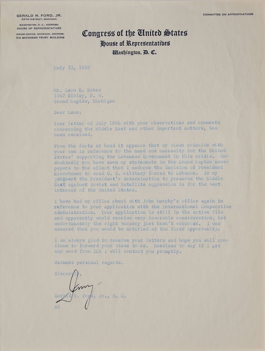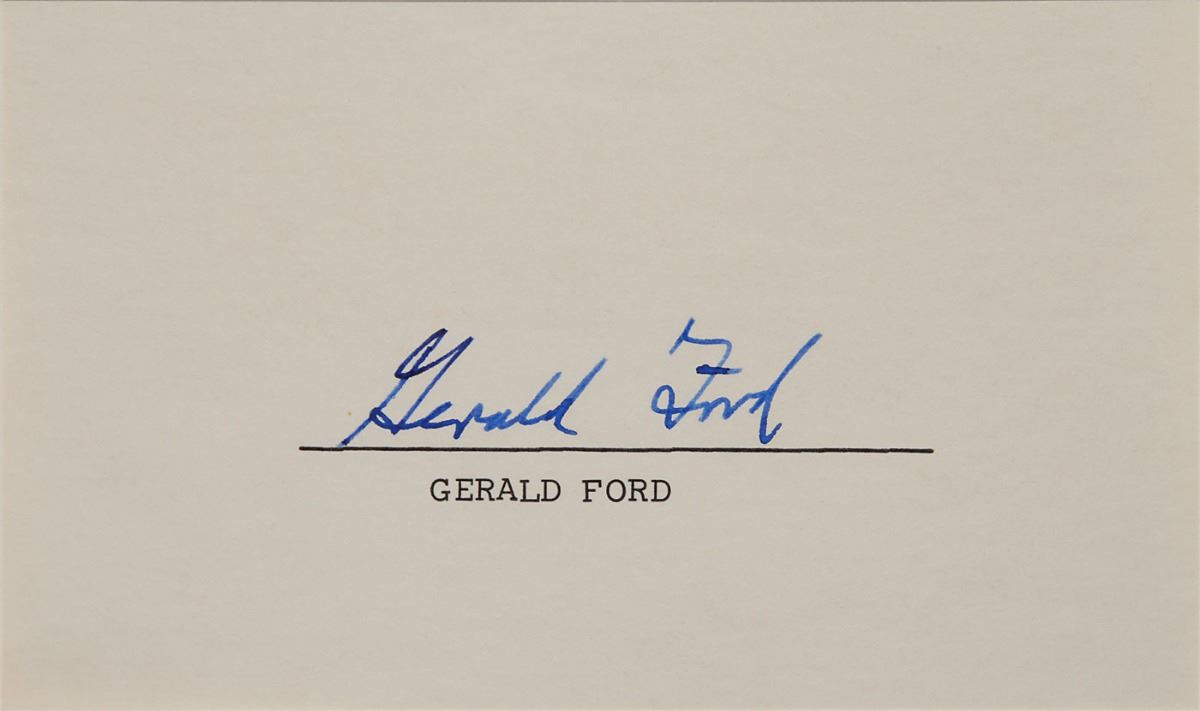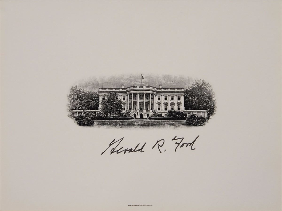 Three items: an official 8 x 6 engraving of the White House, signed in black felt tip, “Gerald R. Ford”; a TLS signed “Jerry,” one page, House of Representatives letterhead, July 23, 1958, commenting on “the need and necessity for the United States’ supporting the Lebenese Government in this crisis…I endorse the decision of President Eisenhower to send U.S. military forces to Lebanon…The President’s determination to preserve the Middle East against Soviet and Satellite aggression is for the best interest of the United States”; and an ink signature, “Gerald Ford,” on an off-white slip. In fine condition.
