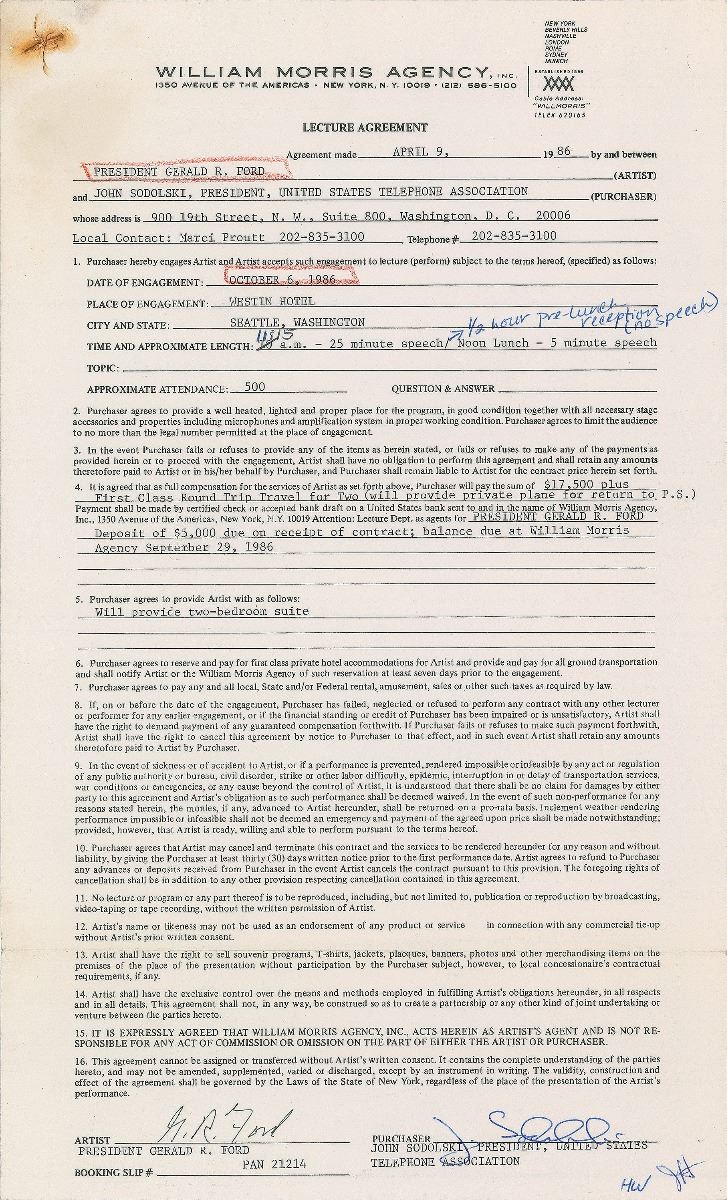 DS, signed “G. R. Ford,” one page, 8.5 x 14, April 9, 1986. William Morris Agency lecture agreement for Ford to appear at the Westin Hotel in Seattle, Washington on October 6, 1986, to give a 25–minute speech. Signed at the conclusion in ballpoint by Ford. In fine condition, with rusty staple holes to upper left corner.
