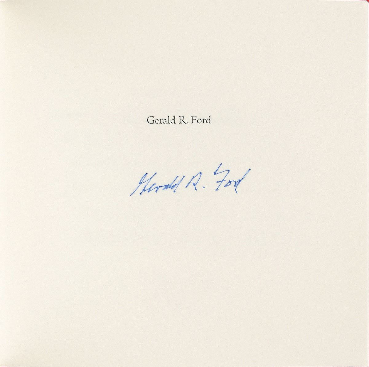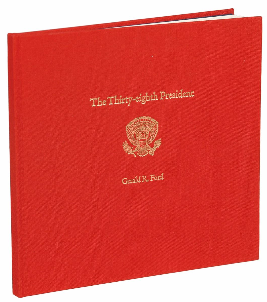 Signed book: The Thirty-eighth President. Limited presentation edition, numbered 3/34. Reno, Nevada: Jack Bacon & Company, 2001. Clothbound hardcover, 8.25 x 8.25, 10 pages. Signed on an opening page in blue felt tip, "Gerald R. Ford." In very fine condition. Pre-certified PSA/DNA.