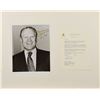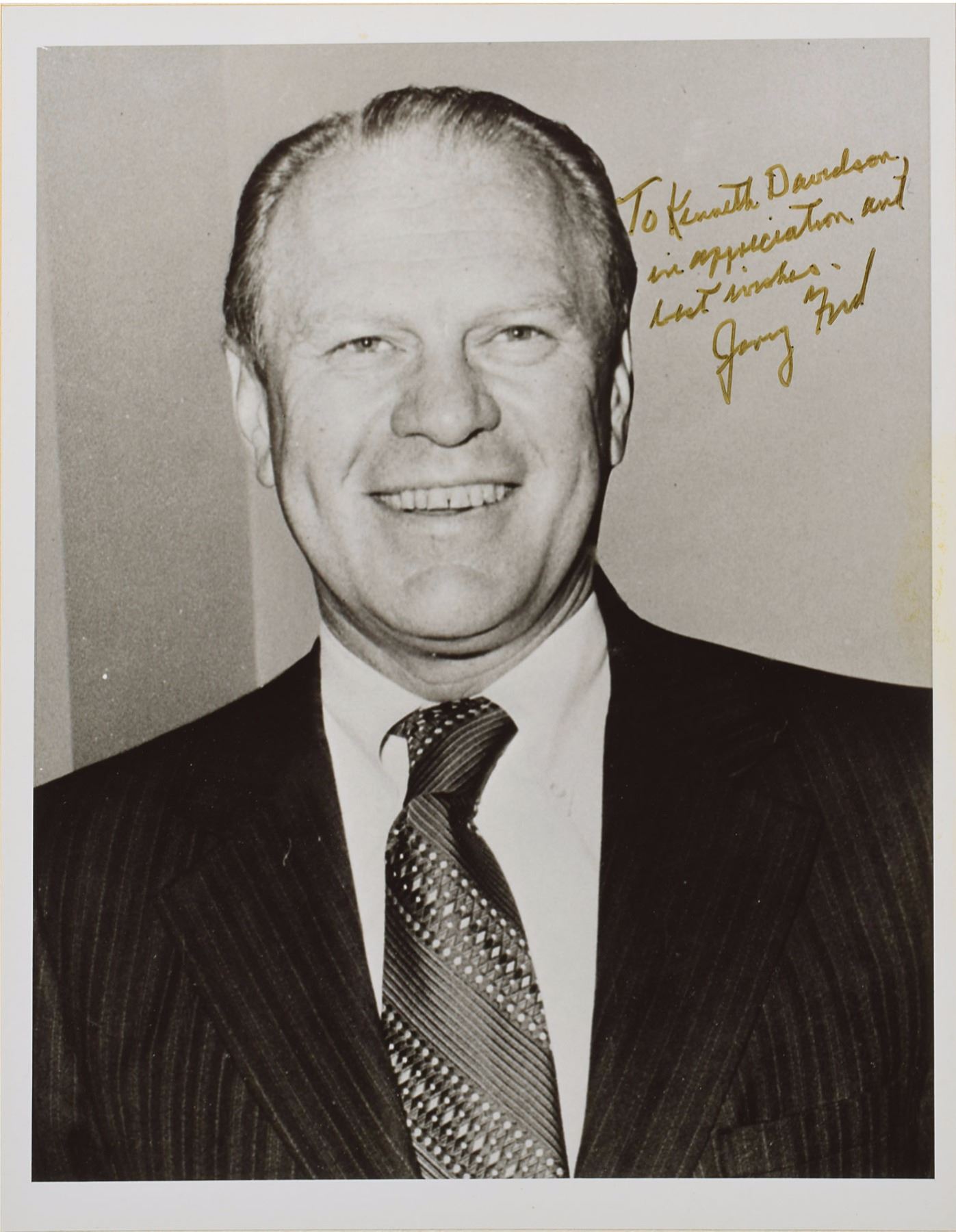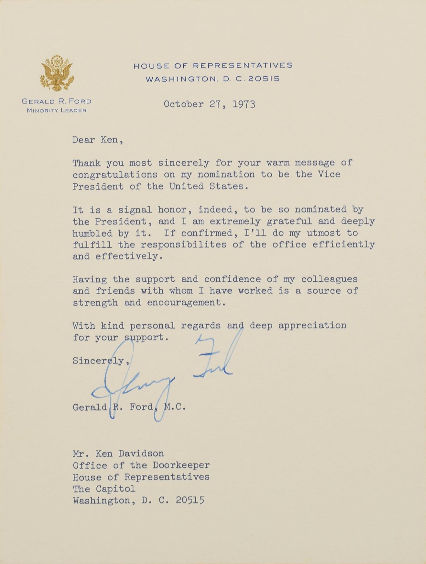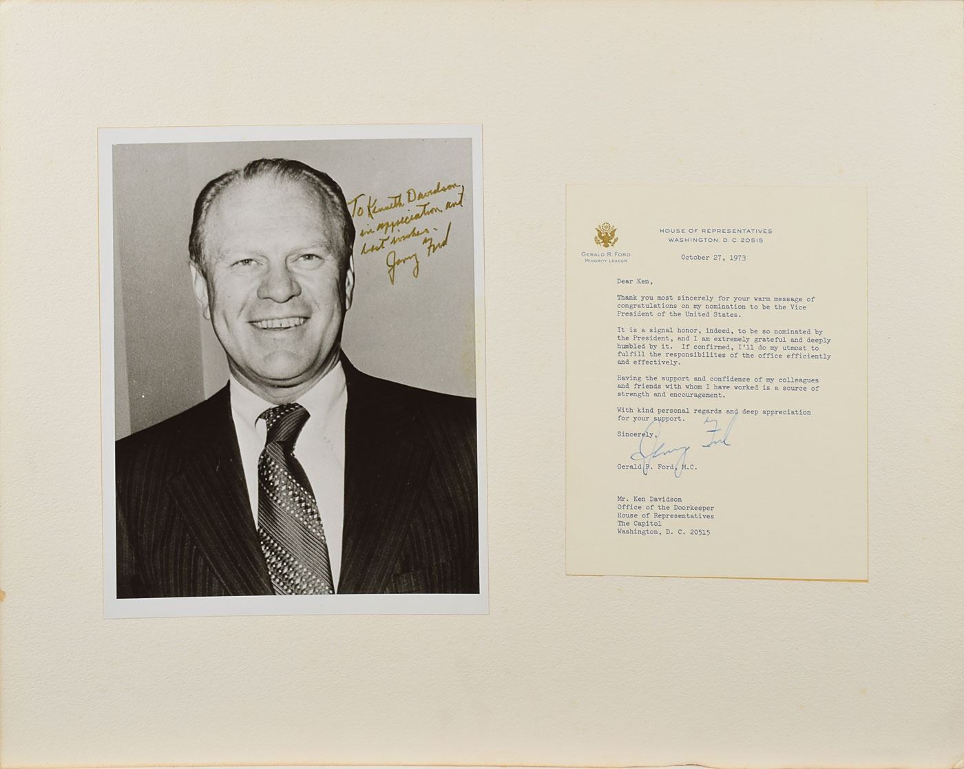 Two items: a TLS signed "Jerry Ford," one page, 6.25 x 8, House of Representatives letterhead, October 27, 1973, addressed to Ken Davidson, the doorkeeper of the House of Representatives, in part: "Thank you most sincerely for your warm message of congratulations on my nomination to be the Vice President of the United States. It is a signal honor, indeed, to be so nominated by the President, and I am extremely grateful and deeply humbled by it. If confirmed, I'll do my utmost to fulfill the responsibilities of the office efficiently and effectively"; and a glossy 8 x 10.25 photo of Ford, signed and inscribed in black felt tip, "To Kenneth Davidson, in appreciation and best wishes, Jerry Ford." Both are affixed to an off-white 20 x 16 cardstock mount. In overall fine condition.