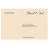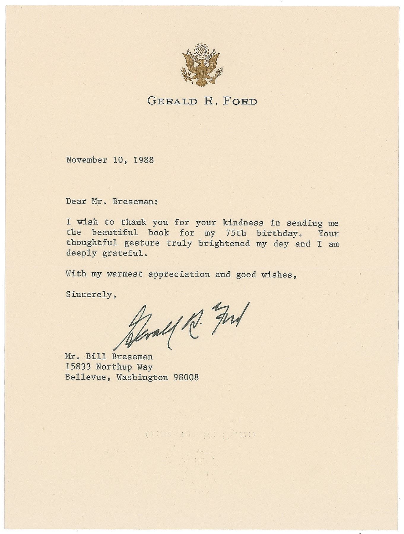 Three TLSs, each signed “Gerald R. Ford,” one page, 6.25 x 8.5, personal letterhead, dated between 1987 and 1988. Each letter is addressed to Bill Breseman. The earliest, July 15, 1987, in part: “You were most generous in your observations on my service as President in your letter…I thank you for this support of the Ford Administration during our difficult challenges at home and abroad while I was in the White House”; the second, November 23, 1987, in part: “Thank you for sending me a copy of the book, ‘A Day in the Life of America’”; and the third, November 10, 1988, in part: “I wish to thank you for your kindness in sending me the beautiful book for my 175th birthday.” In overall fine to very fine condition. Each is accompanied by its original mailing envelope bearing a pre-printed free frank.