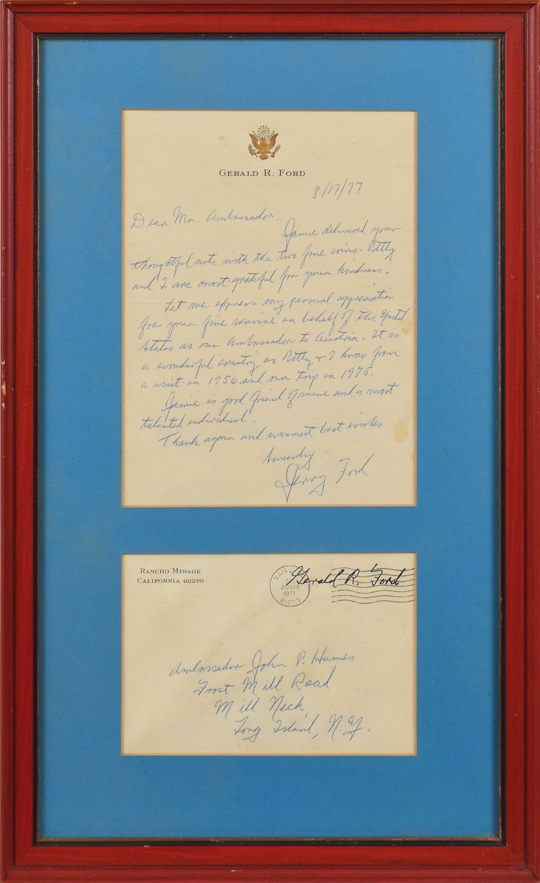 ALS signed “Jerry Ford,” one page, 6 x 8.25, personal letterhead, August 17, 1977. Letter to Ambassador John P. Humes, in part: "Jamie delivered your thoughtful note with the two fine coins. Betty and I are most grateful for your kindness. Let me express my personal appreciation for your fine service on behalf of the United States as our ambassador to Austria. It is a wonderful country as Betty & I know from a visit in 1956 and our trip in 1975." Includes the original envelope addressed in Ford's hand (bearing a pre-printed free frank), matted and framed together to an overall size of 11 x 18. In fine condition, with some small light stains along the right edge and soiling to the envelope. Ford had left the presidency only eight months earlier, retiring to his residence at Rancho Mirage, California.