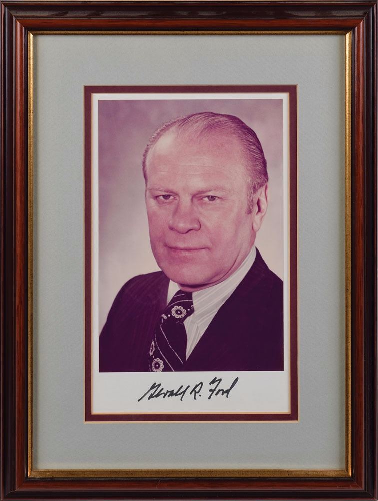Color satin-finish 6 x 9 head-and-shoulders portrait of President Ford affixed to a white 6.5 x 10.5 mount, signed on the mount in black felt tip, "Gerald R. Ford." Double-matted and framed to an overall size of 12.5 x 16.5. In fine condition.