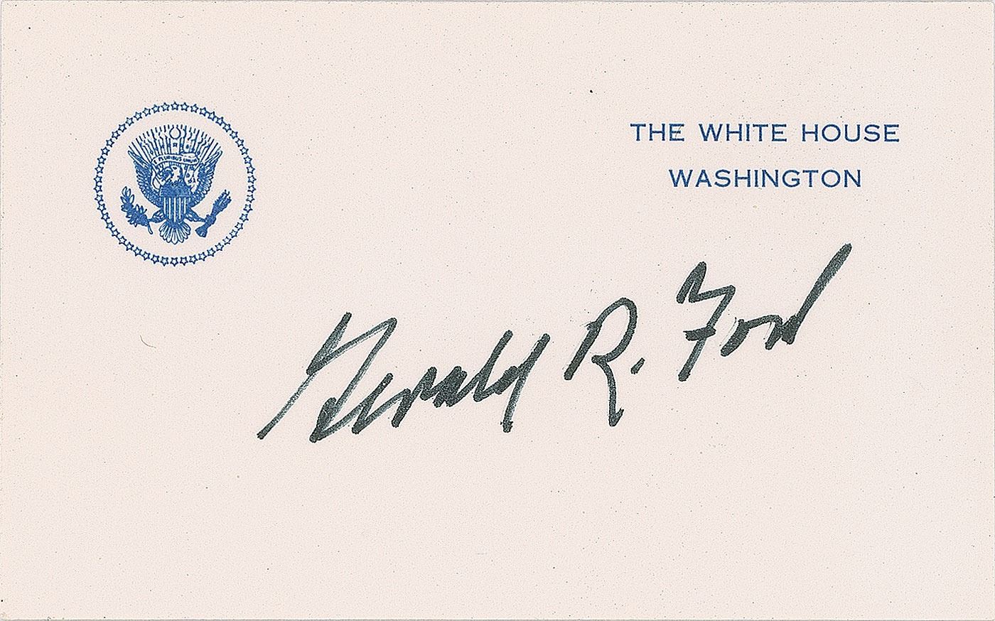 White house card signed in black felt tip, "Gerald R. Ford." In very fine condition. Ford is uncommon in White House cards.