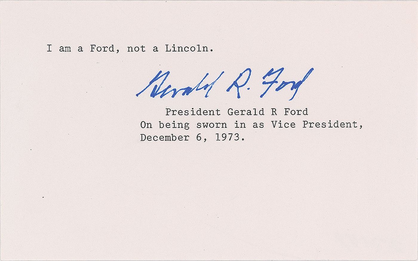 Souvenir TQS on a white 5.5 x 3.5 card, signed in blue felt tip, "Gerald R. Ford." The text reads: "I am a Ford, not a Lincoln. President Gerald R. Ford on being sworn in as vice president, December 6, 1973." In very fine condition.
