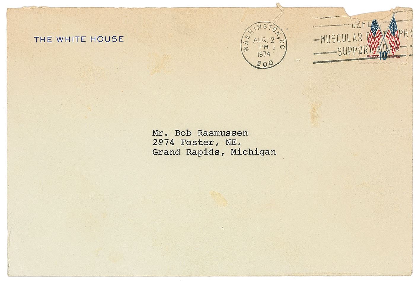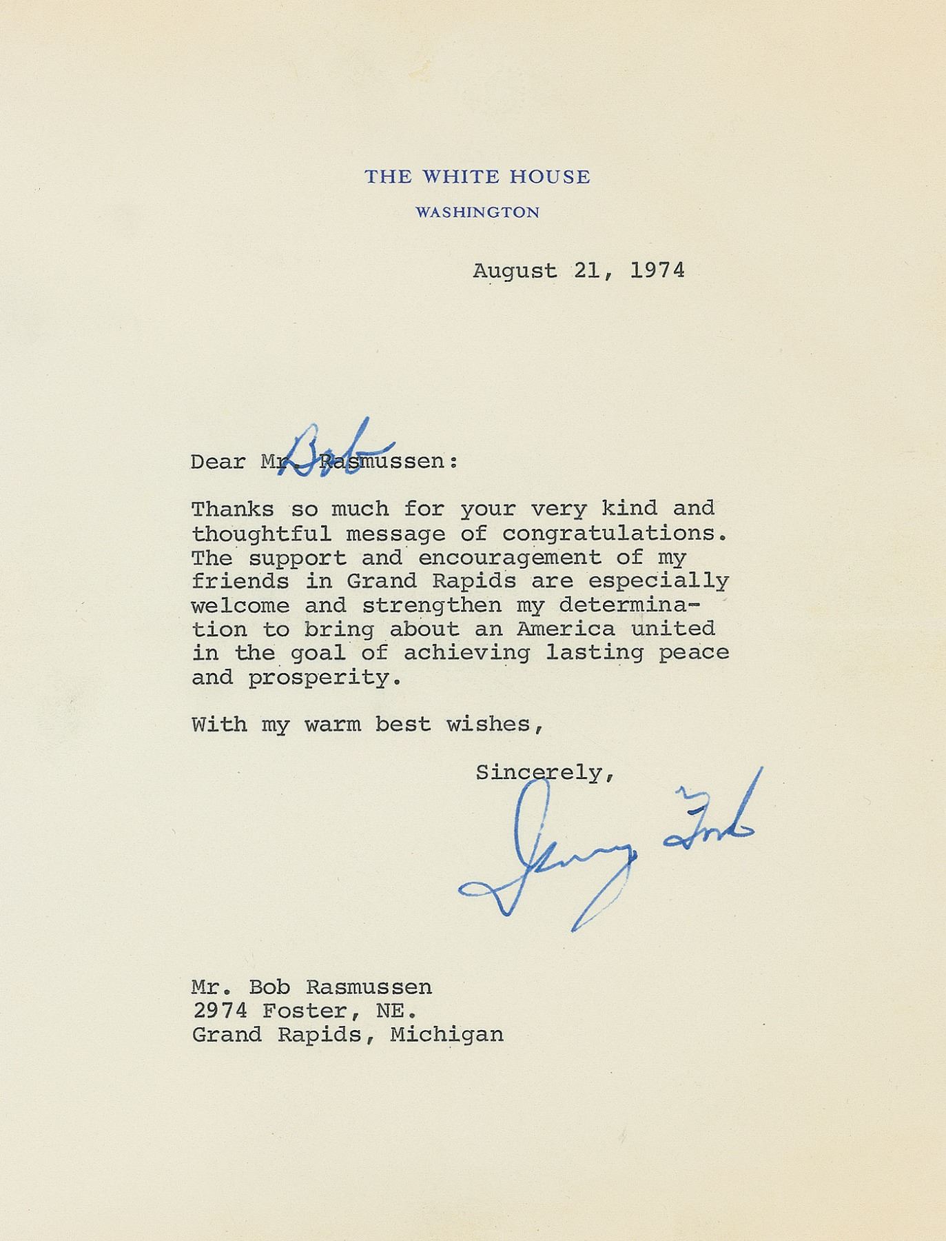 TLS as president signed "Jerry Ford," one page, 6.75 x 8.75, White House letterhead, August 21, 1974. Letter to Bob Rasmussen, in full: "Thanks so much for your very kind and thoughtful message of congratulations. The support and encouragement of my friends in Grand Rapids are especially welcome and strengthen my determination to bring about an America united in the goal of achieving lasting peace and prosperity." Ford has handwritten "Bob" over the original formal salutation. In fine condition. Accompanied by the original mailing envelope. Ford had been sworn in immediately following Nixon's resignation on August 9, 1974, less than two weeks before this letter was written.