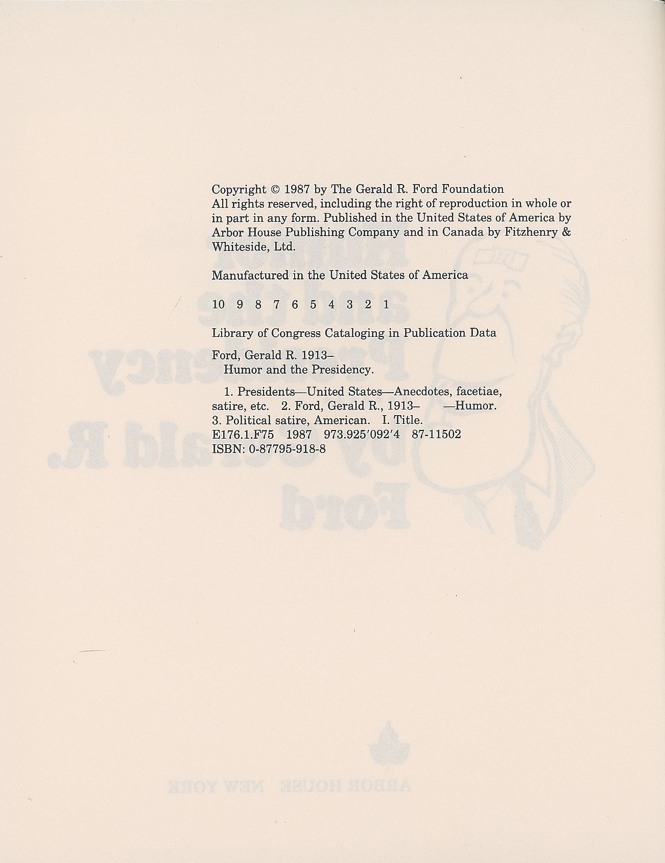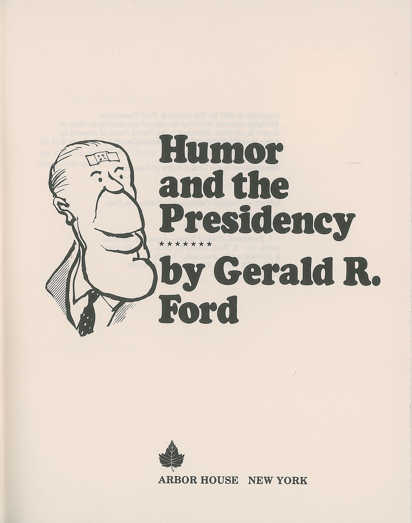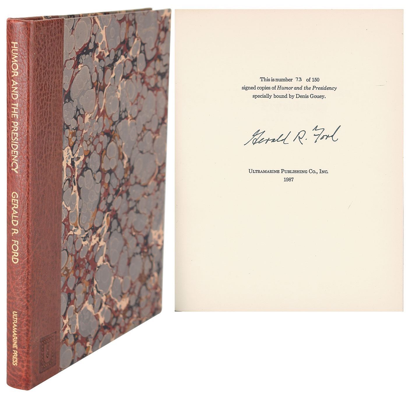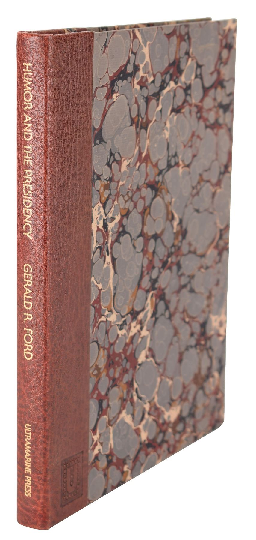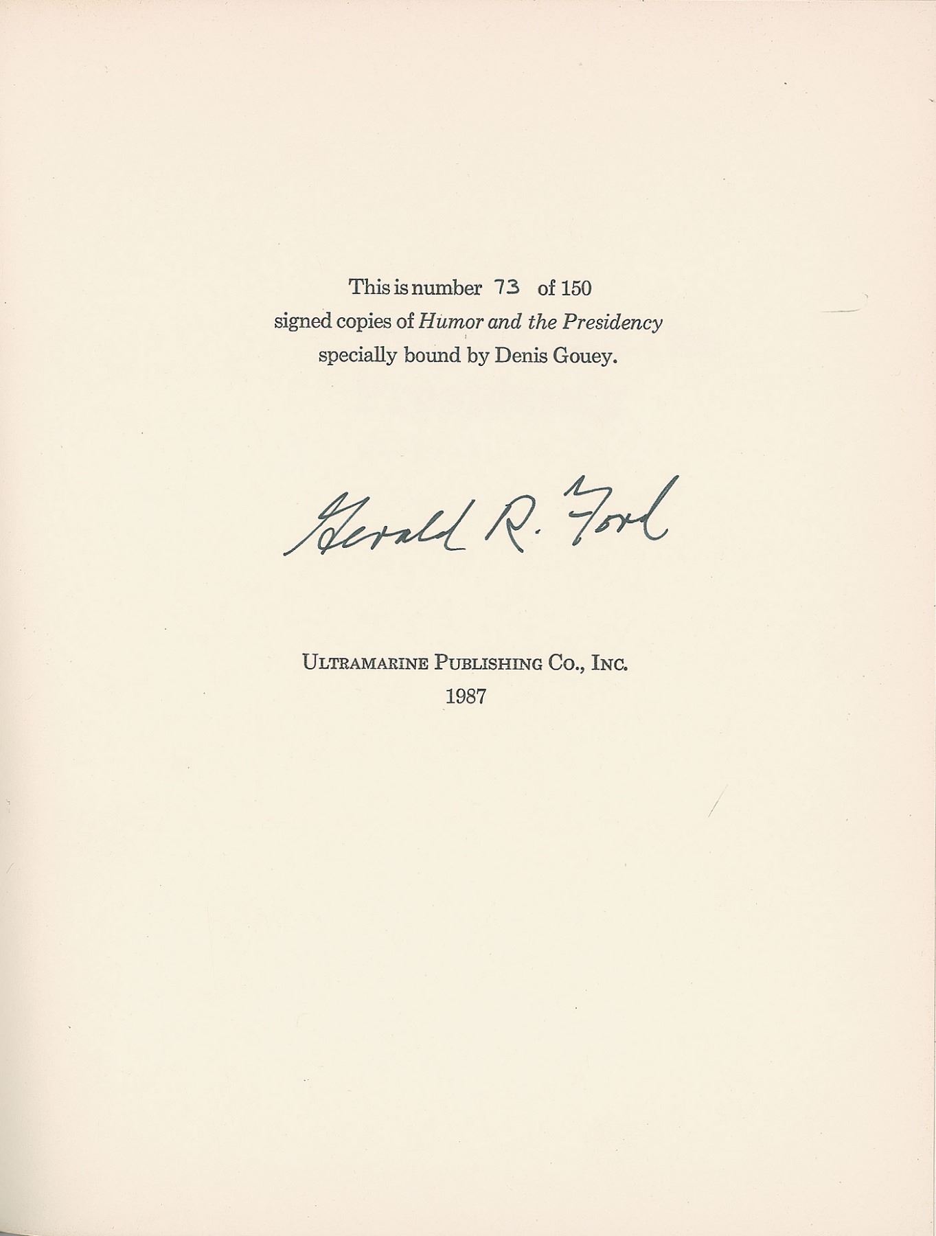 Signed book: Humor and the Presidency. First edition, limited issue specially bound by Denis Gouey for Ultramarine Publishing, numbered 73/150. NY: Arbor House, 1987. Hardcover, 7.5 x 9.5, 162 pages. Signed on the colophon in black felt tip, "Gerald R. Ford." In fine condition.