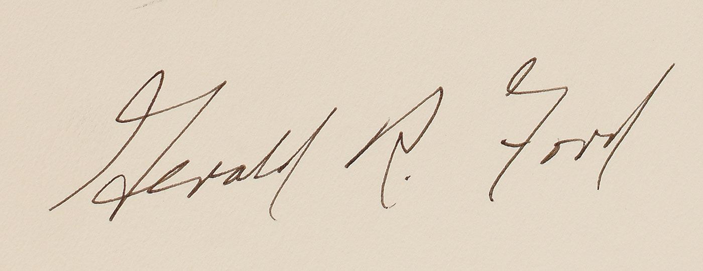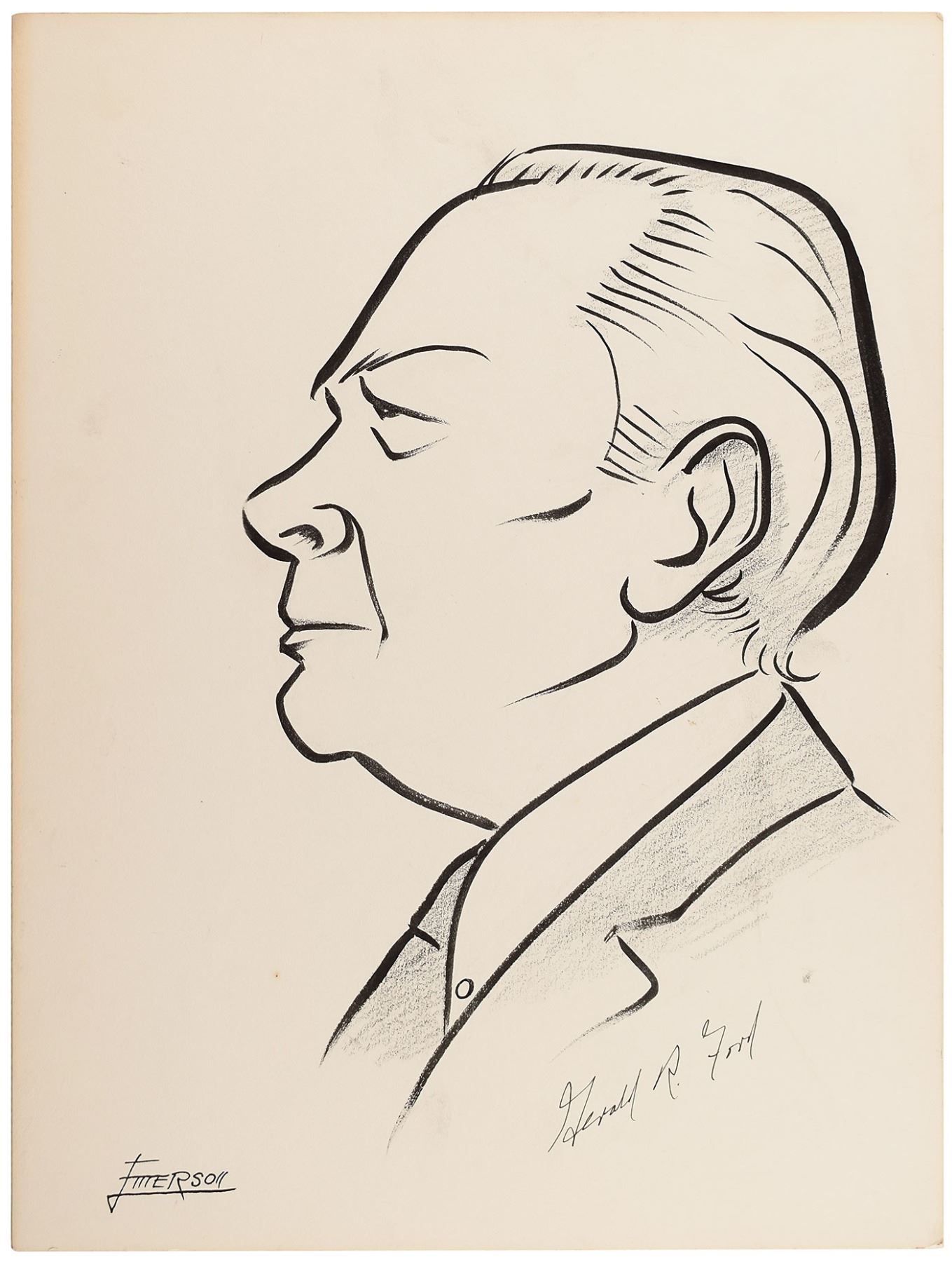 Original sketch of Gerald Ford in a dignified profile pose, accomplished by an unknown artist in felt tip and crayon on an off-white 15 x 20 cardstock sheet, signed below in black ink, "Gerald R. Ford," with the artist also signing in the lower left. In fine condition, with some light smudging in blank areas.
