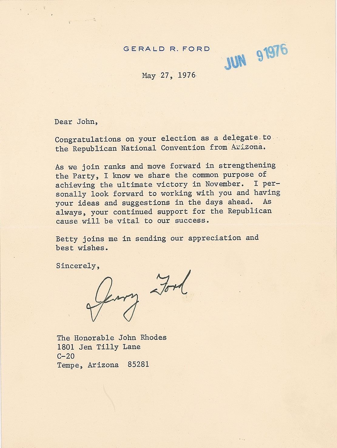 TLS as president signed “Jerry Ford,” one page, 6.25 x 8.5, personal letterhead, May 27, 1976. Letter to the Hon. John Rhodes, in part: "Congratulations on your election as a delegate to the Republican National Convention from Arizona. As we join ranks and move forward in strengthening the Party, I know we share the common purpose of achieving the ultimate victory in November. I personally look forward to working with you and having your ideas and suggestions in the days ahead. As always, your continued support for the Republican cause will be vital to our success." In fine condition, with staple holes to the upper left corner. Accompanied by the original mailing envelope.
