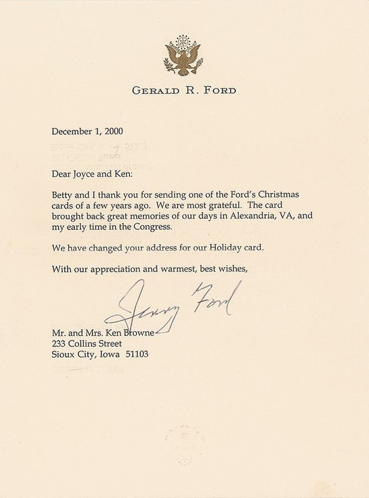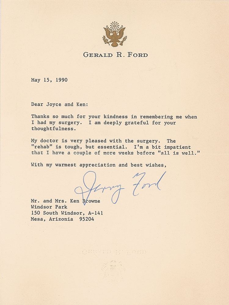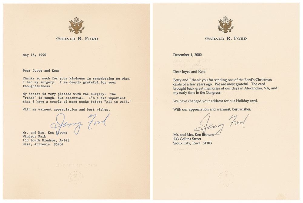 Two TLSs signed "Jerry Ford," each one page, 6.25 x 8.5, dated 1990 and 2000. The first, written shortly after having knee replacement surgery, in part: "Thanks so much for your kindness in remembering me when I had my surgery. I am deeply grateful for your thoughtfulness. My doctor is very pleased with the surgery. The 'rehab' is tough, but essential. I'm a bit impatient that I have a couple of more weeks before 'all is well.'" The second, in part: "Betty and I thank you for sending one of the Ford's Christmas cards of a few years ago. We are most grateful. The card brought back great memories of our days in Alexandria, VA, and my early time in Congress." In overall fine condition.