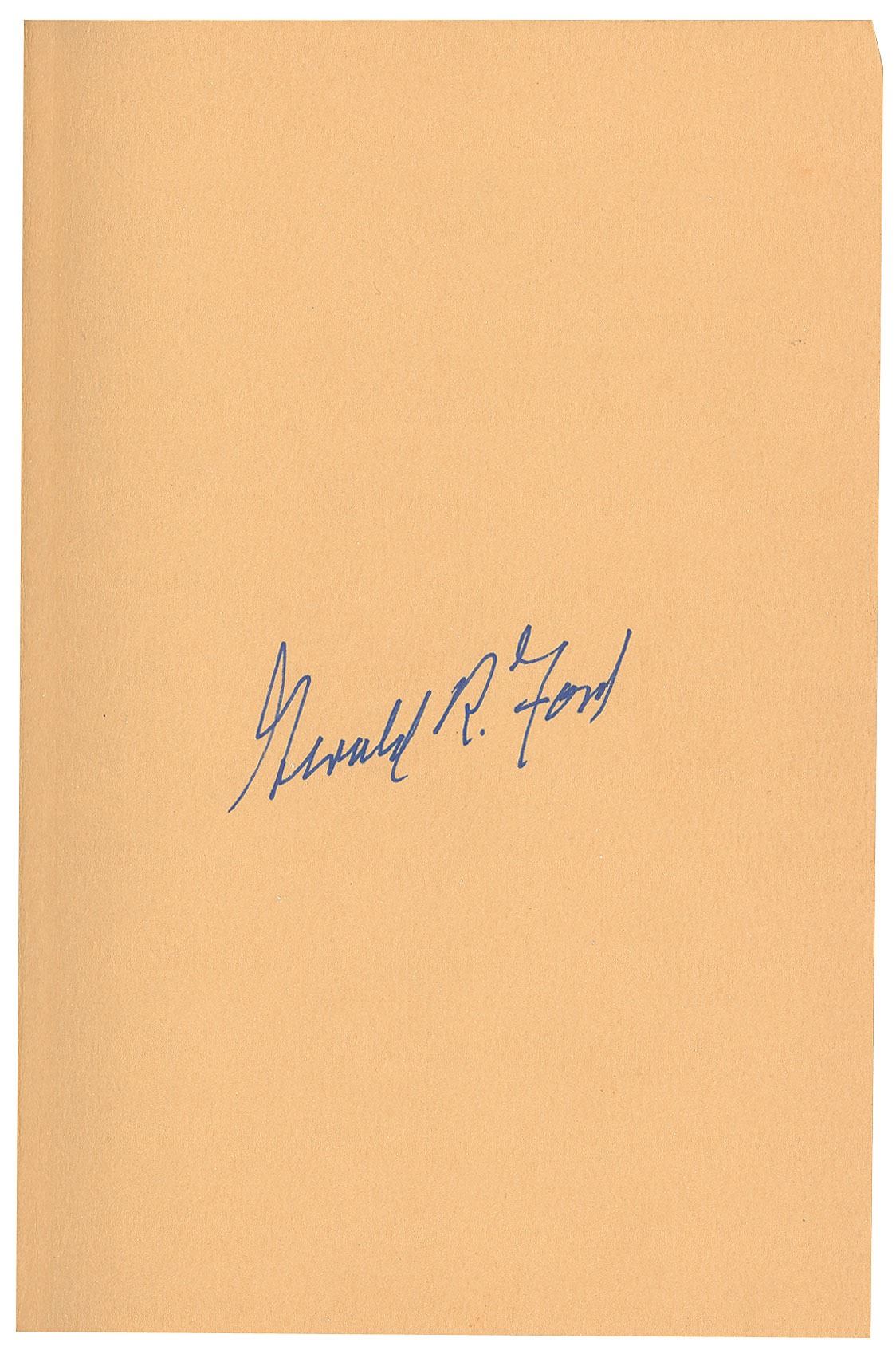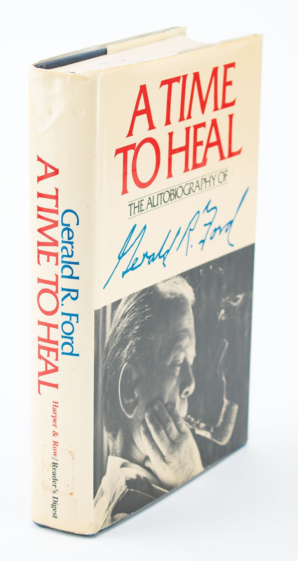 Signed book: A Time to Heal. First edition. NY: Harper and Row, 1979. Hardcover with dust jacket, 6.5 x 9.5, 454 pages. Signed on the first free end page in blue felt tip, "Gerald R. Ford." In fine condition, with light wear to the dust jacket.