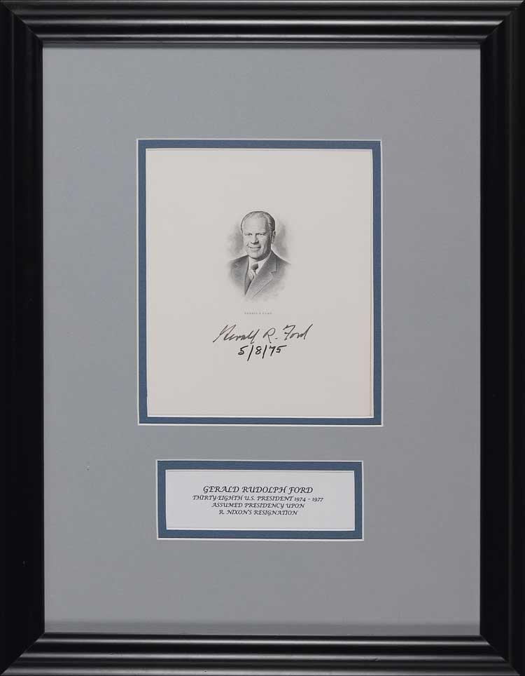 Engraved portrait of Ford, 6 x 7, signed in black felt tip, as president, “Gerald R. Ford 5/8/75.” Double matted and framed with a biographical caption, to an overall size of 14 x 18. In very fine condition. RRAuction COA.