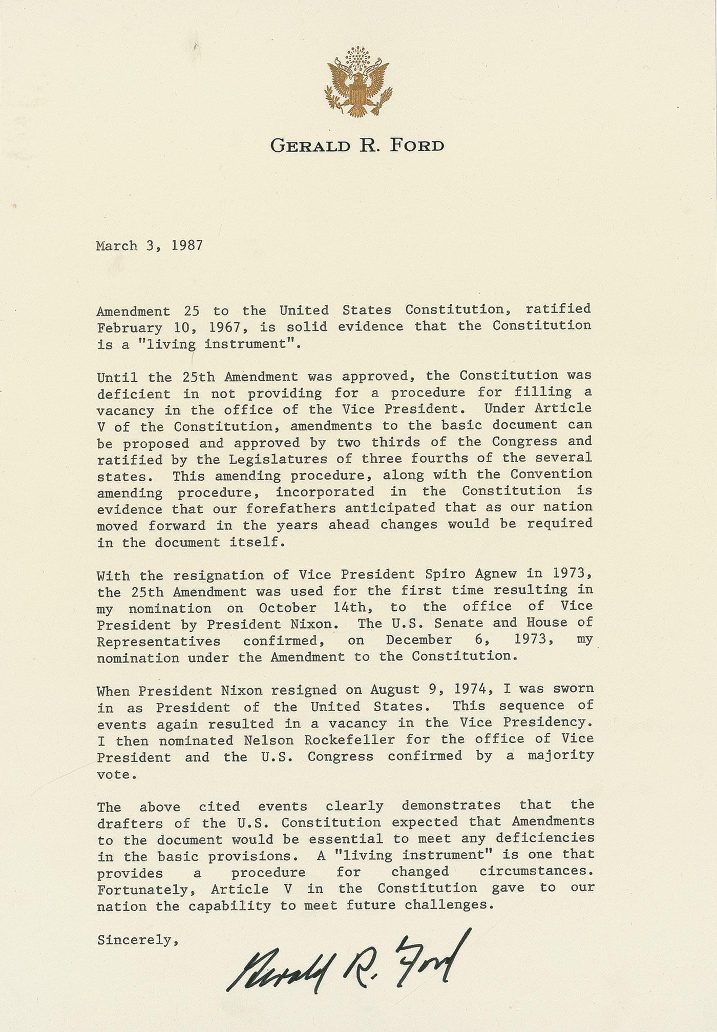 Historic printed statement on his personal embossed letterhead, signed “Gerald R. Ford,” 7.25 x 10, March 3, 1987. Ford describes the process and enactment of the 25th Amendment, by which he became Vice President—and later, President. In part: “Amendment 25 to the United States Constitution, ratified February 10, 1967, is solid evidence that the Constitution is a ‘living instrument.’ Until the 25th Amendment was approved, the Constitution was deficient in not providing for a procedure for filling a vacancy in the office of the Vice President…. With the resignation of Vice President Spiro Agnew in 1973, the 25th Amendment was used for the first time resulting in my nomination on October 14th, to the office of Vice President by President Nixon. The U.S. Senate and House of Representatives confirmed, on December 6, 1973, my nomination under the Amendment to the Constitution. When President Nixon resigned on August 9, 1974, I was sworn in as President of the United States. This sequence of events again resulted in a vacancy in the Vice Presidency. I then nominated Nelson Rockefeller for the office of Vice President and the U.S. Congress confirmed by a majority vote. The above cited events clearly demonstrates that the drafters of the U.S. Constitution expected that Amendments to the document would be essential to meet any deficiencies in the basic provisions. A ‘living instrument’ is one that provides a procedure for changed circumstances. Fortunately, Article V in the Constitution gave to our nation the capability to meet future challenges.”