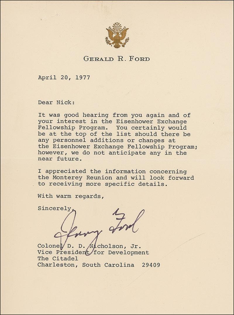 TLS signed “Jerry Ford,” one page, 6.5 x 8.5, personal letterhead, April 20, 1977. Letter to Colonel D. D. Nicholson, Jr., at the Citadel. In part: “It was good hearing…of your interest in the Eisenhower Exchange Fellowship Program. You certainly would be at the top of the list should there be any personnel additions or changes at the Eisenhower Exchange Fellowship program; however, we do not anticipate any in the near future.” In fine condition, with staple hole to top left corner. RRAuction COA.