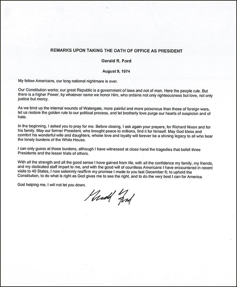 Souvenir typescript, one page, 8.5 x 10.25, Ford’s Remarks on Taking the Oath of Office on August 9, 1974, signed at the conclusion in black felt tip. In very fine condition. RRAuction COA.